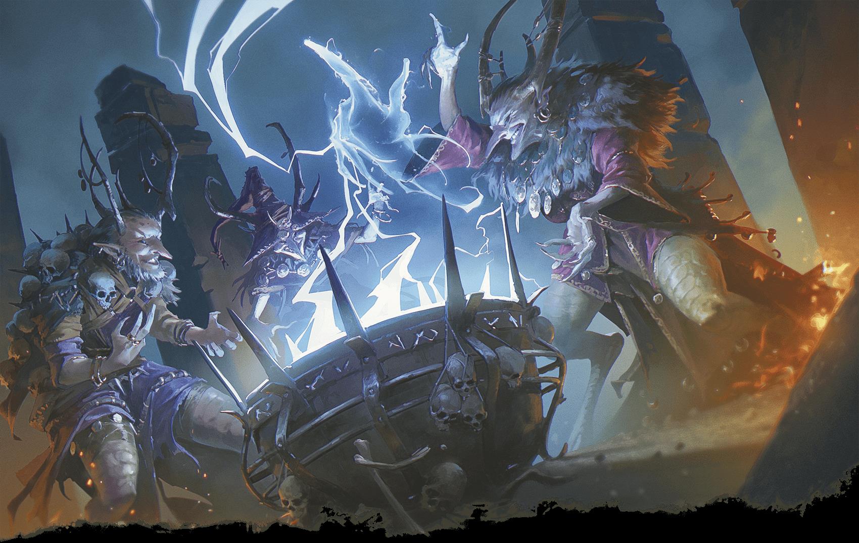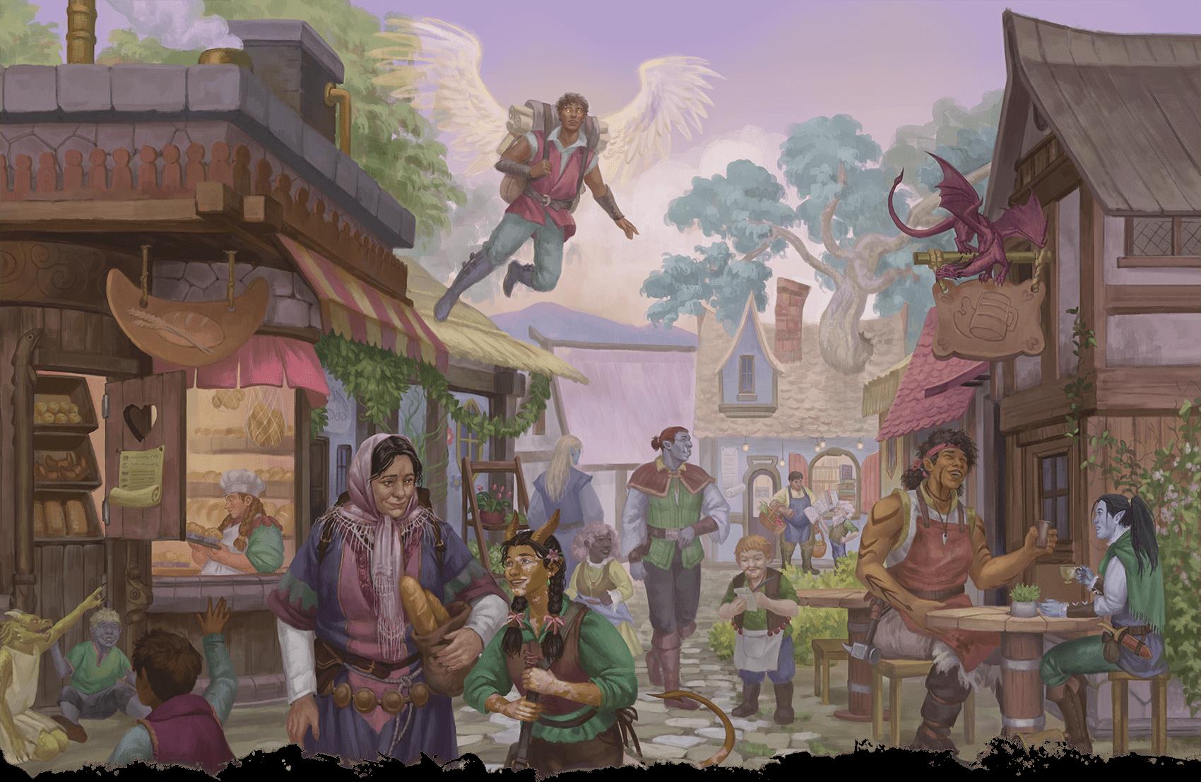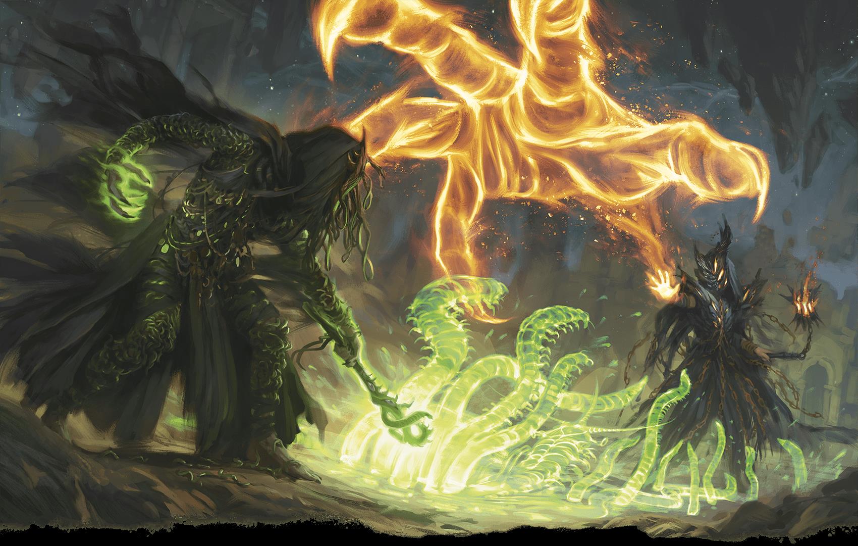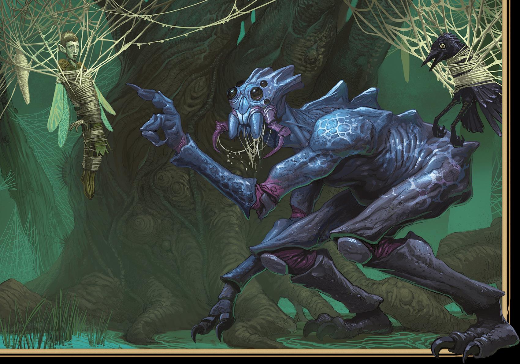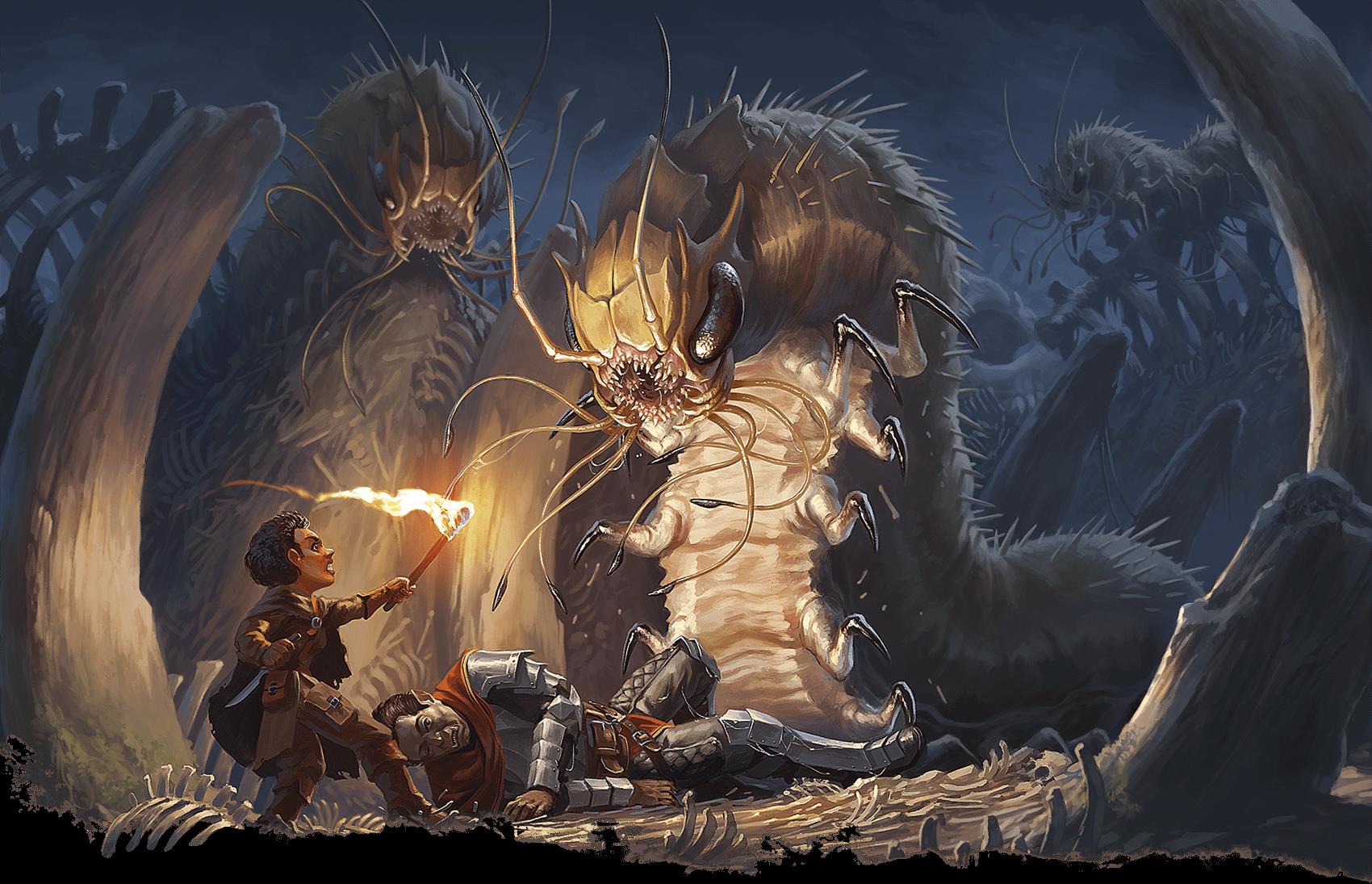 Not only have these creatures been repainted with fresh eyes, they are now drawn in dynamic, context-rich scenarios. Very few monsters stand in front of a blank background as in Monster Manuals of the past. Almost all are flying, fighting, or fumbling around environments. Often they’re giving an enemy what for. At the very least, it brings greater scale to gargantuan creatures like Tarrasques and Purple Worms, or shows off their diminutive nature like Quasits and Faerie Dragons.