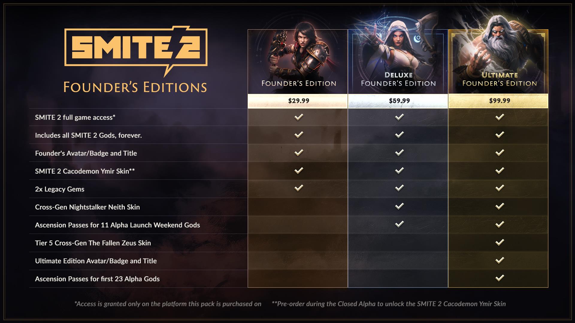 The Founder's Editions will be available to purchase all the way up to the game officially launches. There are three tiers of Founder's Editions, all of which include additional goodies including the Ultimate God Pack which will get you every future god released for free, skins and 2X legacy gems. Check out the breakdown chart below to see everything each pack includes. Here is the pricing for each edition.