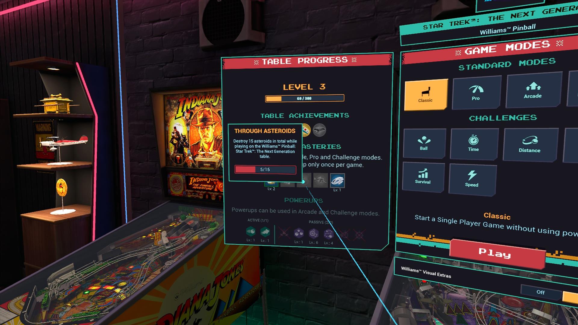 3) Instant restart on games would be so appreciated. I absolutely loved the awesome VR animation of the Ark of the Covenant opening up and Indiana Jones hiding his face that plays at the end of a game the first time I saw it. Not so much the 45th time. Having to sit through all of the ending screens on the machine and the animation is a great touch, to be sure, and it adds to the authenticity of the table reproduction. But when I am doing a one-ball challenge and I gotta sit through it every time, it starts to wear out its welcome. Having a button to quickly tee up the next round would be super. (And I know I can kind of do this through the pause menu, but that wipes out the progress from the last round, which I don't want.)