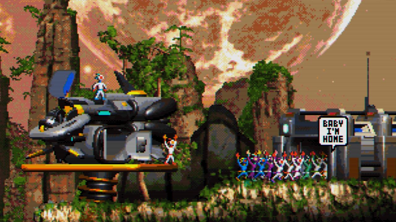 Looking a bit at how the sausage is made, Moons of Darsalon features a retro pixelated art style that blends 2D sprites with 3D models for some objects. It also throws in modern lighting techniques and realistic physics, which are quite striking in its pixelated environments. It throws a CRT filter on top of it all for good measure, and the result is a modern retro (metro?) video game that both looks great and feels great to play. It sounds great too, with a vibey 8-bit sci-fi soundtrack, and terrific sound effects that stand out the most. The Laser Gun sounds like it was ripped straight out of the original Star Wars films, and I adore it.
