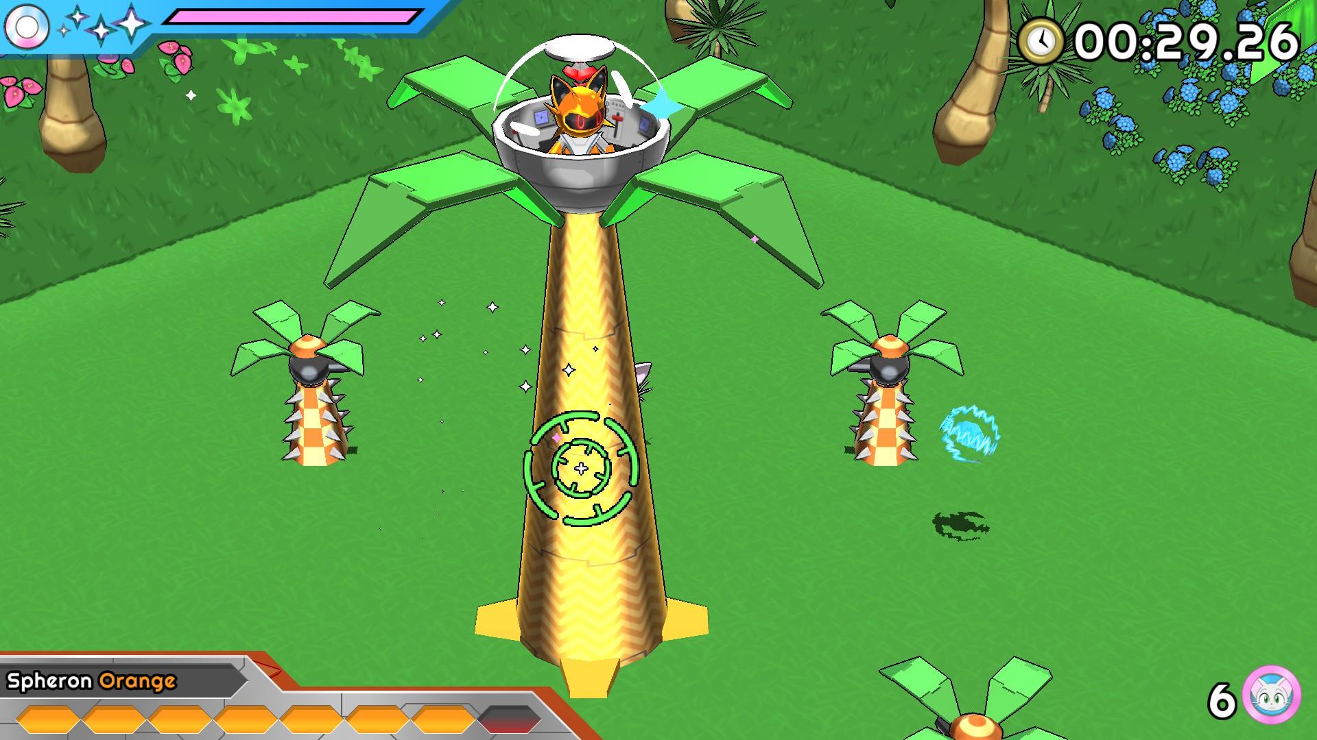 Probably the biggest issue I came across was Dynacat’s speed, especially when it came to platforming. Often times, I felt myself having to slow down due to not knowing what obstacles or enemies were up ahead. There are warnings on the ground that’ll tell you when to jump over gaps or to tether enemies to get to different areas, but several times I was speeding through a stage when out of nowhere I’d hit an enemy causing me to take damage. After a few times of this, I tended to take the stage a lot more cautiously which kind of goes against what the game wants you to do. A lot of the time you can just speed through, and once you know your way around the stage it gets a lot easier, but if you plan to look for crystals to get to those Special Stages, speeding your way through might get you into a bit of trouble. In addition, there will be some areas where, while in a boosted state, you’re directed to run up the side of a wall, but doing so at just the wrong angle can send you flying off the wall and possibly into a pit as opposed to landing safely back on the ground. It’s hard to describe without seeing it in action but a couple of the final stages are perfect examples.