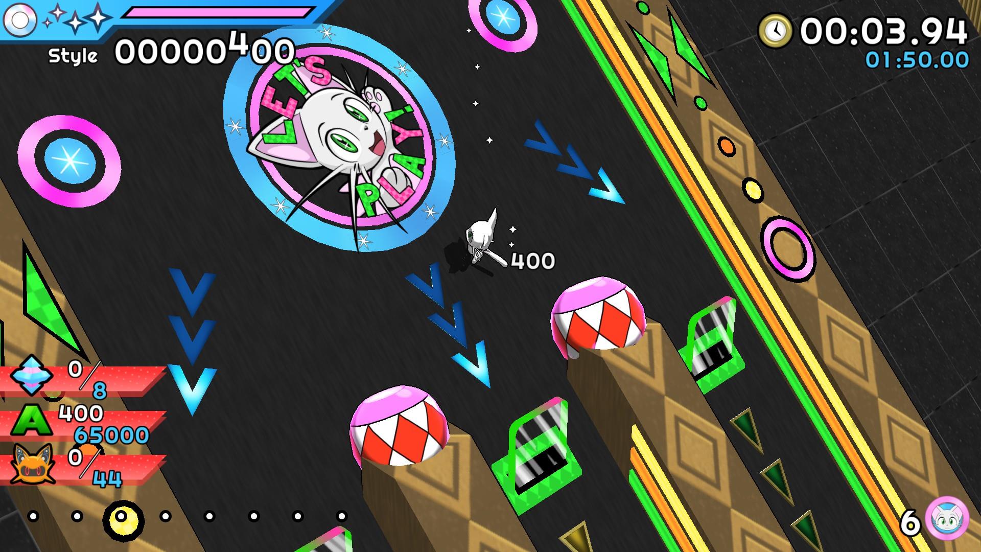 Dynacat has a couple of abilities at his disposal, one of which is a tether he can use to home in on enemies from above to pull him towards them, or to grab projectiles fired by certain enemies to fling back at them. You can also tether certain poles to help change direction while boosting or to fling yourself to a higher platform. This is all useful to traverse certain areas and find hidden crystals, but there is a bit of a caveat. While the tether can take out a lot of enemies from above, it won’t from ground level. That’s a bit puzzling to be honest, since you can still fire the tether at ground level, but it seemingly doesn’t affect enemies (or if it does I just have terrible aim). Your other ability is boosting. Aside from the zip pads you’ll find lying around the stage which will set Dynacat blazing forward at high speeds, if you run for a few seconds you’ll see a prompt to hit a button and activate a boost. Boosting allows you to dash at a high speed and can hit certain springs to access different paths or hidden areas. However, if you make too sharp of a turn while running, you’ll lose your speed before you can activate the boost (sharp turning while boosting will also cause you to lose your boost).