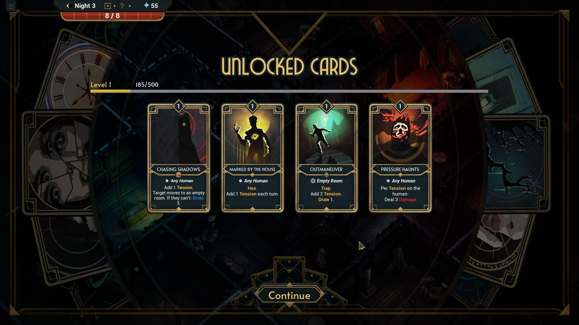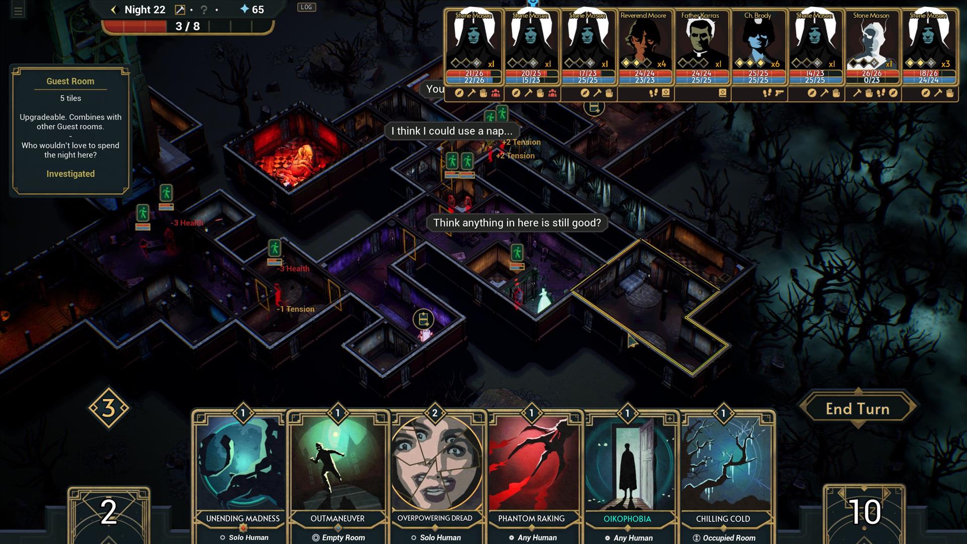You also have cards that don't deal any hits to health or sanity but can raise the tension for those in the room, lock doors for a single turn, or teleport them to different parts of the house. Raising tension will give you a boost when you use cards that drain their sanity. Killing the investigators or draining their sanity will grant you "essence," which is the currency you use between rounds to build out the house.