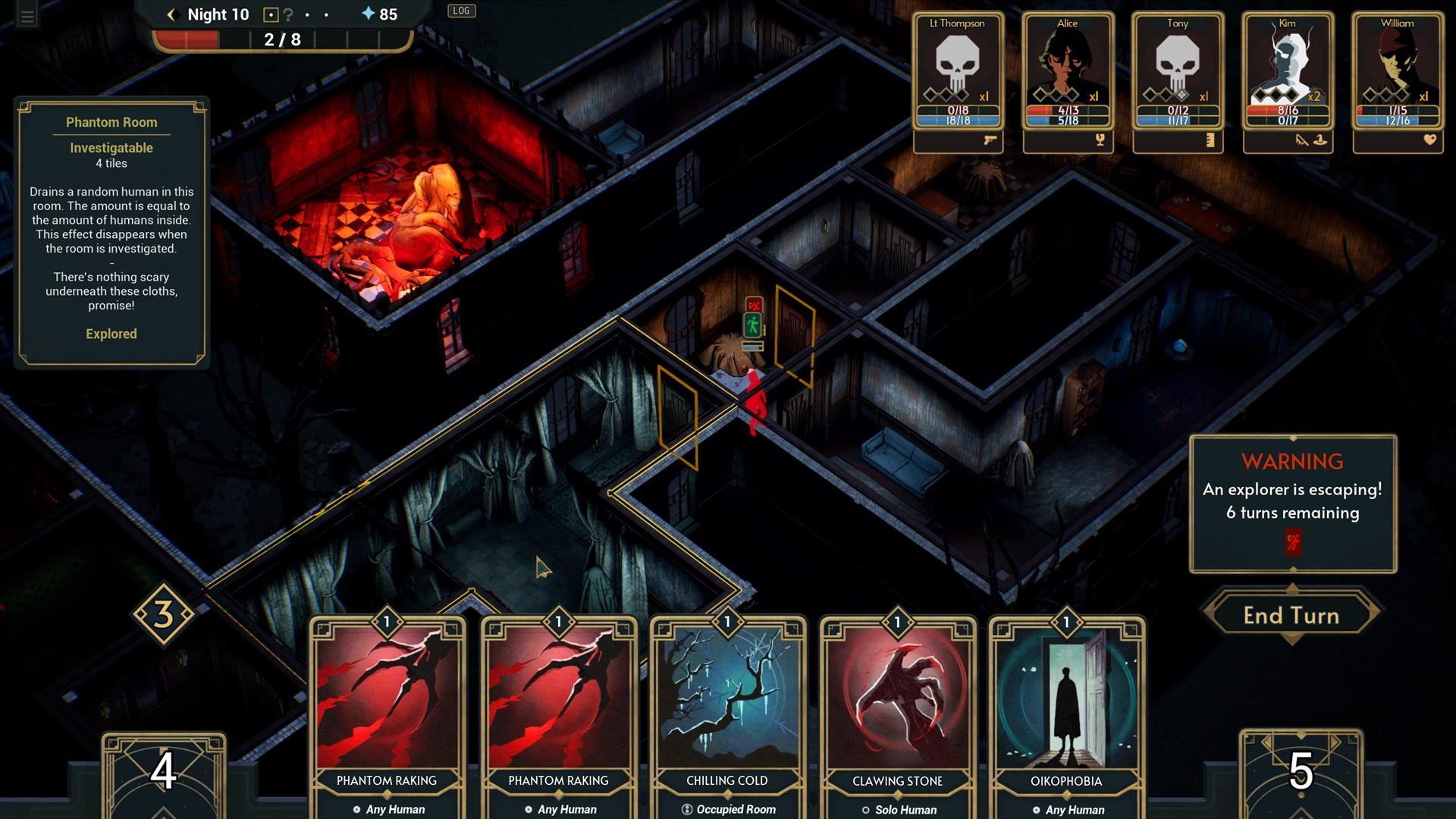 You also have a decision to make as to how you want to dispatch the trespassers in your house. Lowering their sanity to 0 will cause them to just sit down where they are and not move for the rest of the round. While outright killing a person by draining their health may be easier and faster, you need to be careful because if someone else in the house sees a dead body they will instantly turn around and quickly head towards the exit. You'll get a notification saying this is happening with a message saying, "A person is escaping," with how many turns left until they escape. If they escape then you will lose essence, which is your currency. This however can work in your favor as you can kill someone right before the door to the heart room which will send them towards the exit in the opposite direction. Your heart starts with 8HP, and anytime someone enters the room it will lose 1HP.