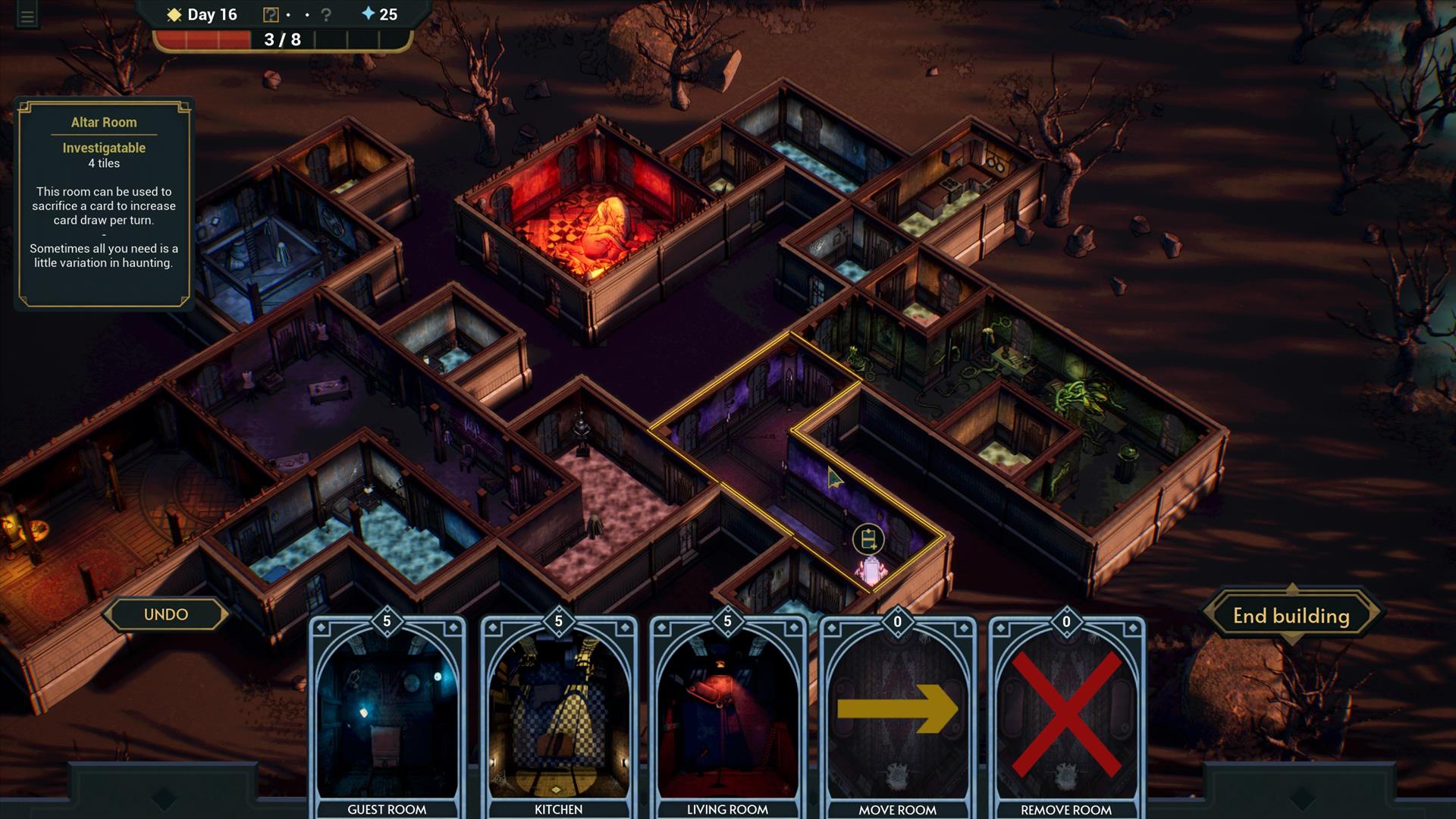 You only get so many rooms you can place down each day, and you have to always have at least one path to the heart room to proceed. It's always exciting when you advance through the days and get new rooms you can put down.