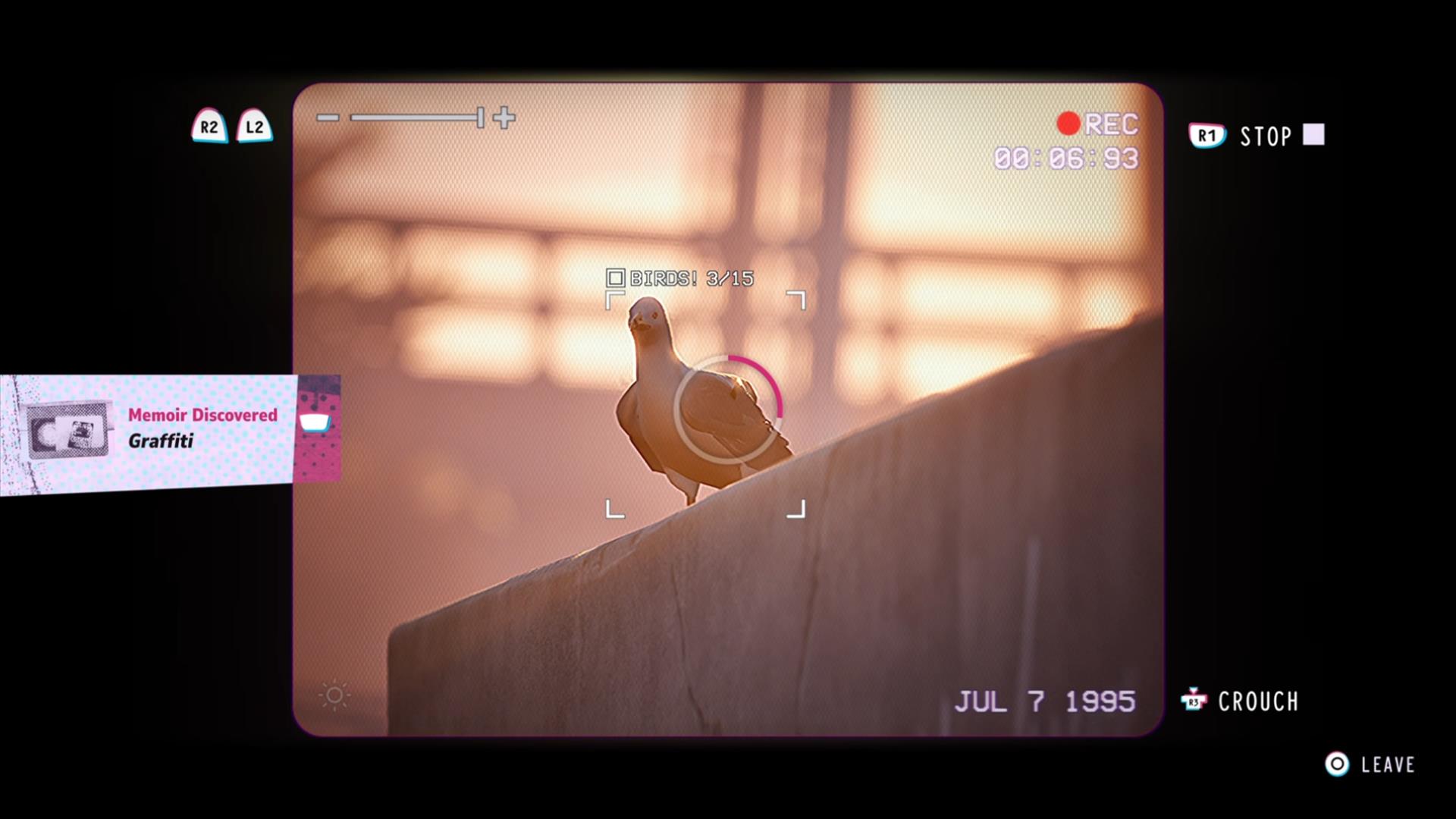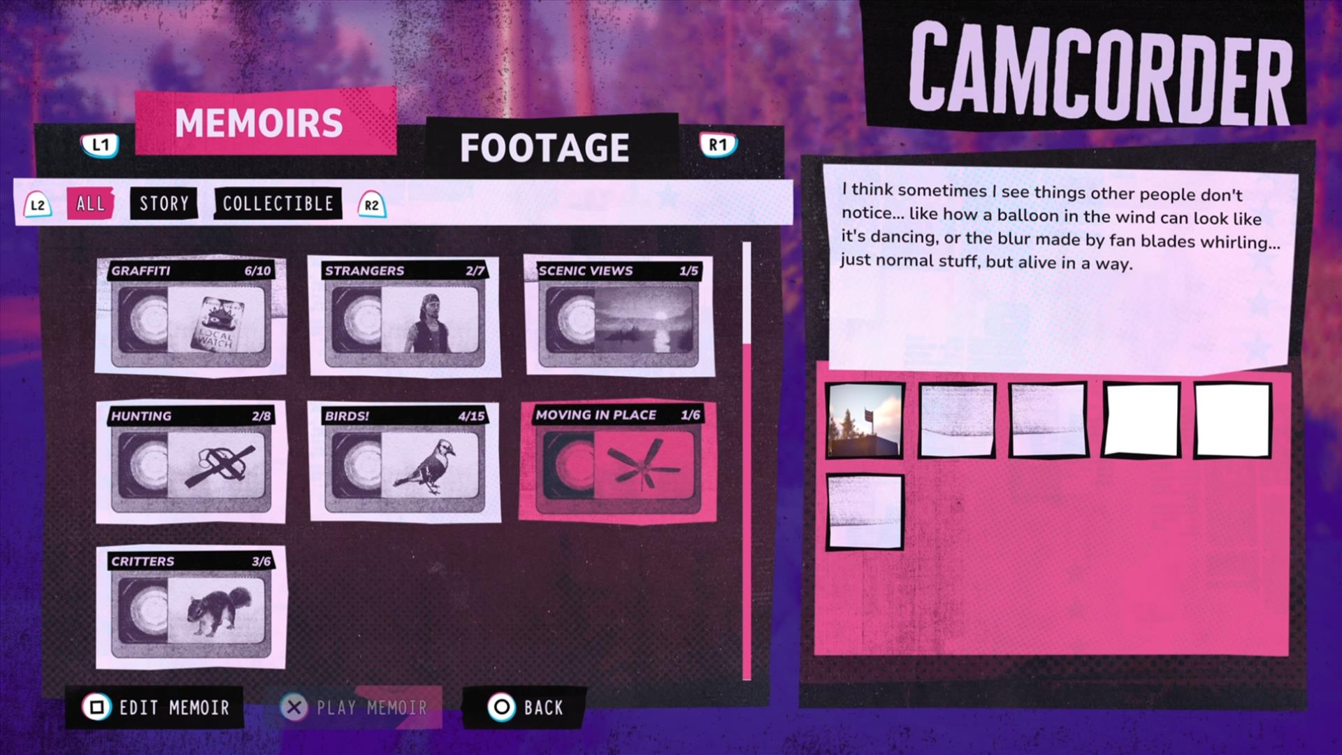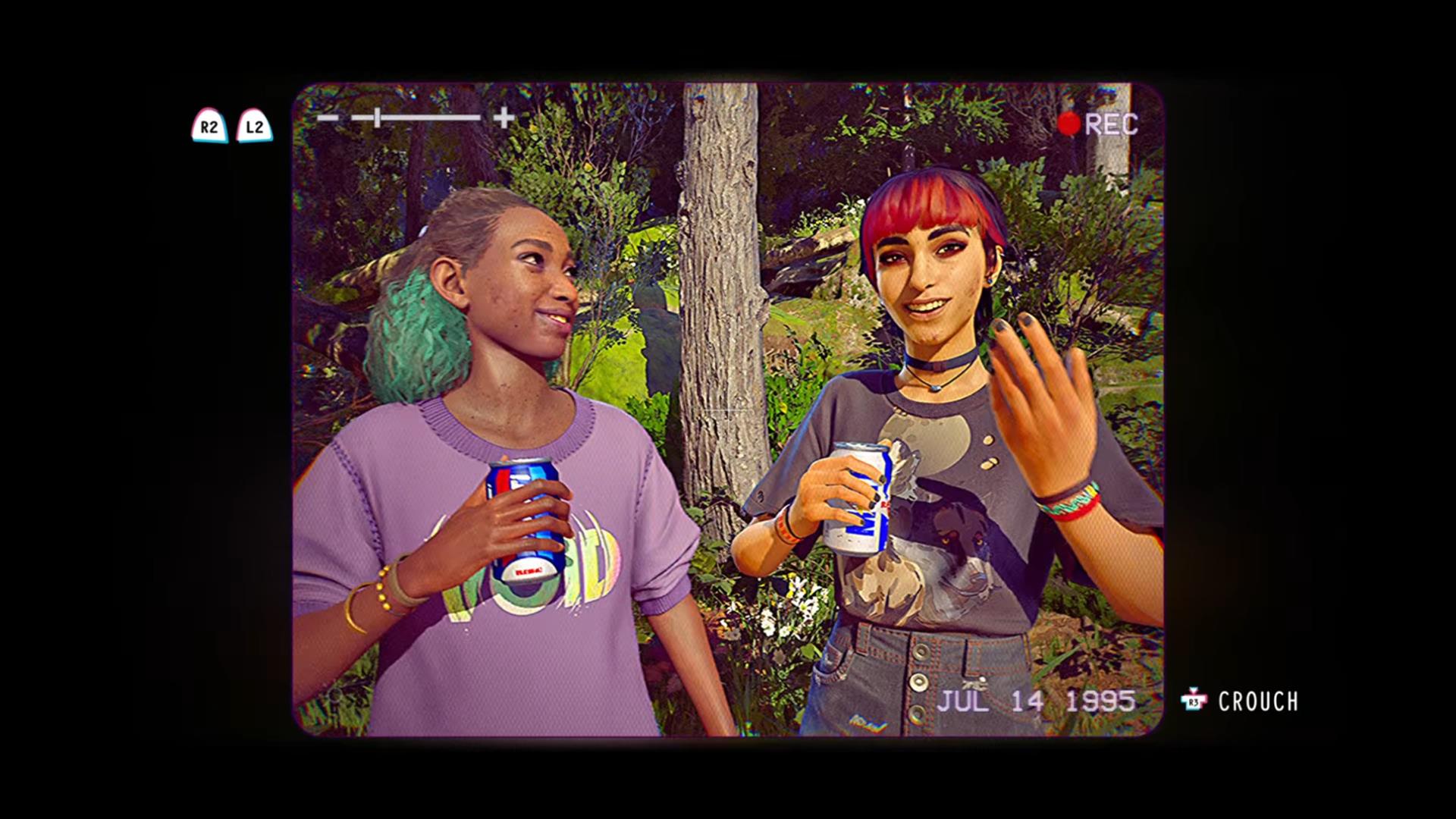 The best part of the game, in my opinion, is Swann’s camera. While playing in 1995, you can press the R1 button to bring up Swann’s camcorder and record anything you want in eight-second increments. The game encourages you to film things like nature, bugs, the other girls, and locations around Velvet Cove. You can then place these video clips into a sequence to create a memoir of Swann’s adventures, narrated by Swann herself. There are memoirs for each of the girls, landscapes, and important locations like the video store, a playground, and an abandoned house the girls find in the woods. This feature was a ton of fun, and I honestly felt like some kind of creepy stalker with the camera because I kept filming the girls over and over again to get the perfect footage for the memoirs. Not to mention, the game is beautiful to look at. A lot of this episode takes place in the fictional forest areas of Velvet Cove, and I spent a ton of time just filming scenery, birds, squirrels, deer, and more.