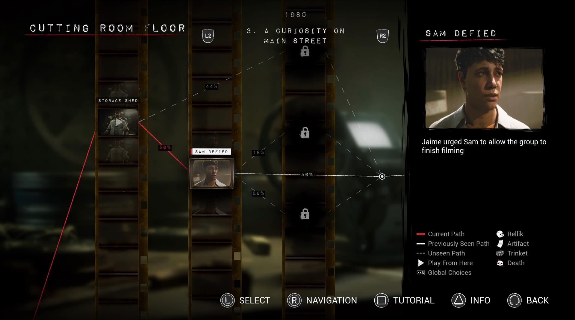 In terms of the length, personally I didn't mind it's short length at all. I believe games, movies, TV shows etc... should only be as long as they need to in order to tell their stories and The Casting of Frank Stone was the perfect length to tell the story. It also helps the game is short because of the Cutting Room Floor feature, which is unlocked after you finish the game. The Cutting Room Floor basically acts as a flowchart that will show the path you took through the game but will also show you the other paths that were available, along with unlockables that are in the area and a global percentage of what path other players took. You can start your playthrough from a number of points in the game, usually before major choices or deaths can happen and will let you go through and see the other paths that were available. That is another reason I prefer the shorter length of this title, because there are some choices that you can make at the beginning of the game which will only come into play again during the finale, so blowing through this game multiple times to see everything shouldn't take much time.