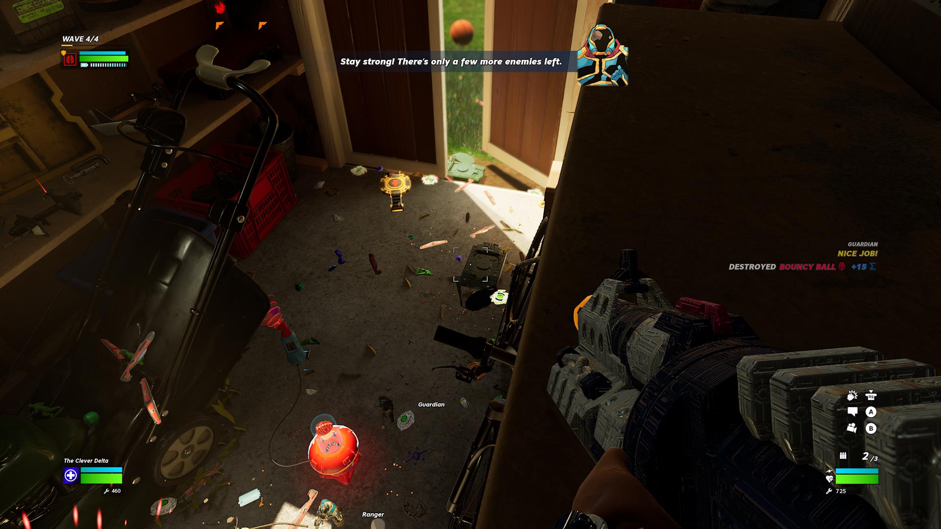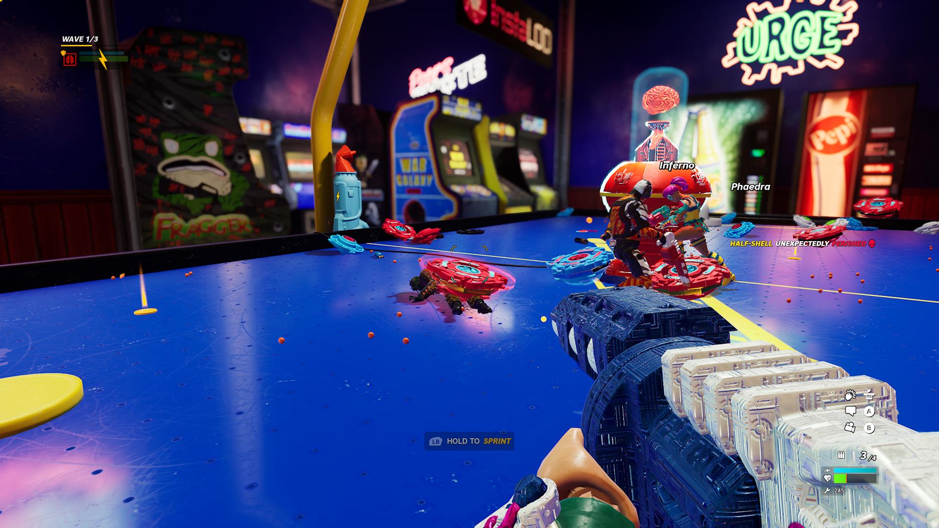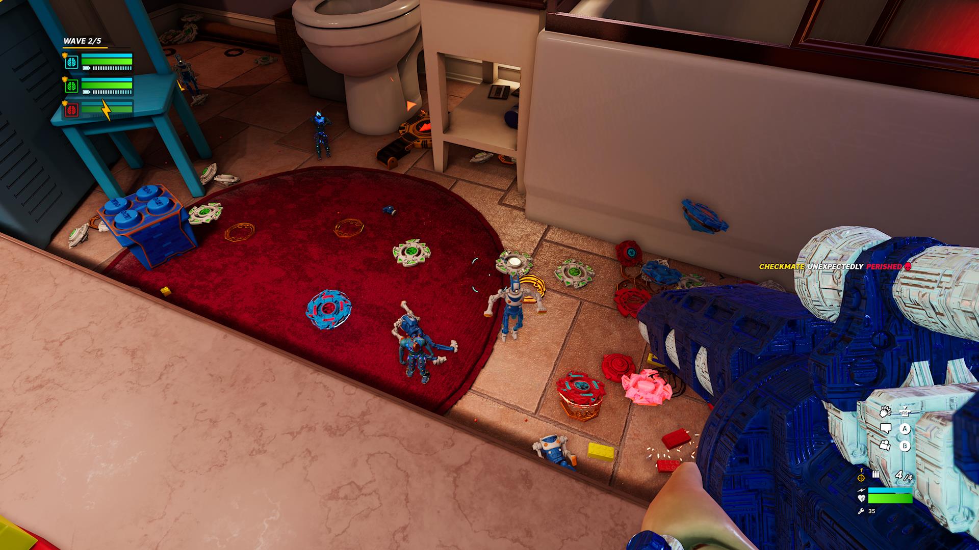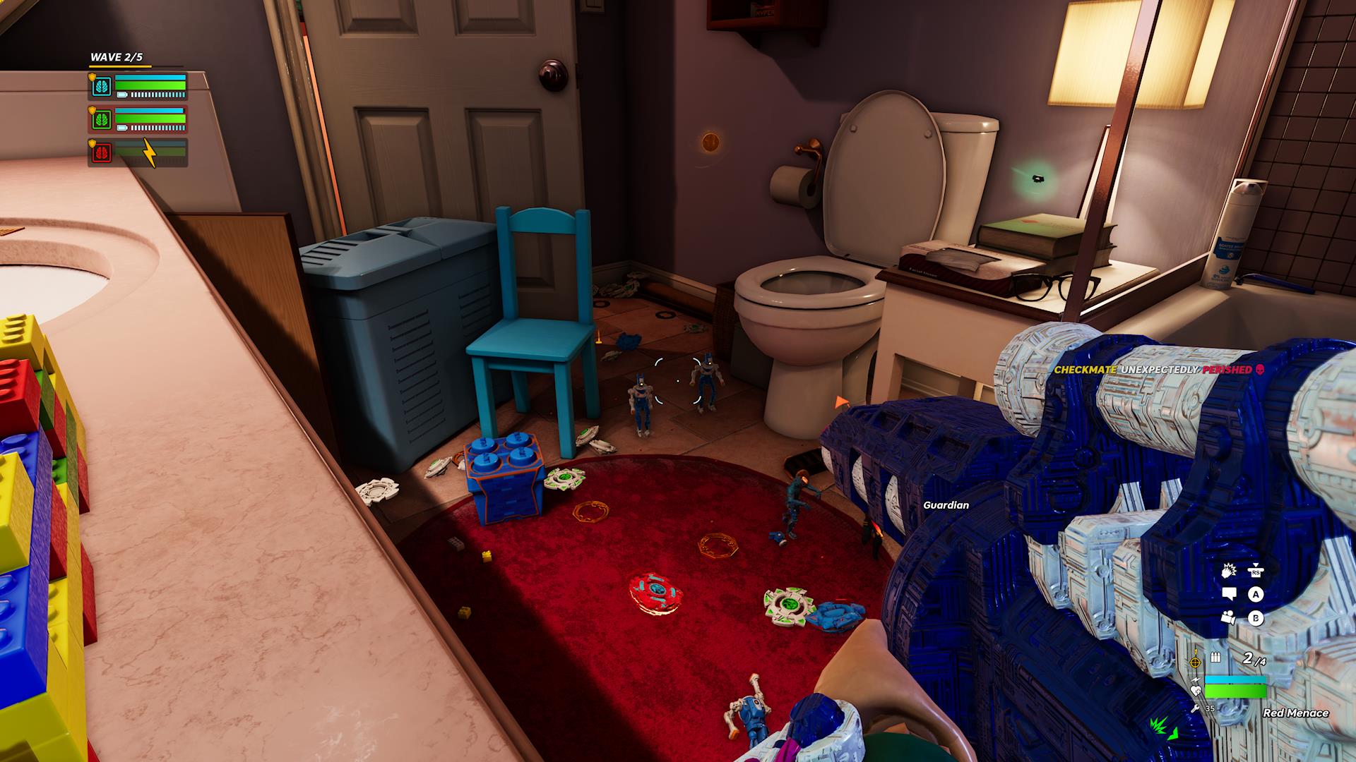 The most important part of the gameplay, the guns and the shooting, work very well. My only issue is that your characters feel very heavy, especially when it comes to traversal. You can jump and double jump, but it really feels like your character is a brick when jumping. Jumping and trying to grab onto ledges or traverse the area from jumping from a window sill to a trash can to a cabinet can is easier said than done at times. It's not completely game-breaking and it doesn't ruin the fun but it can get annoying at times, especially where there are levels where you start high up on shelves or an air hockey table and you can't touch the ground or else you die. Thankfully, there are jump pads around the map that will launch you up to the higher areas so for the most part it's easy to get around the map. It's when you start searching around for hidden collectibles, weapons, or coins where you have to make precise jumps, which can be a pain to nail down.