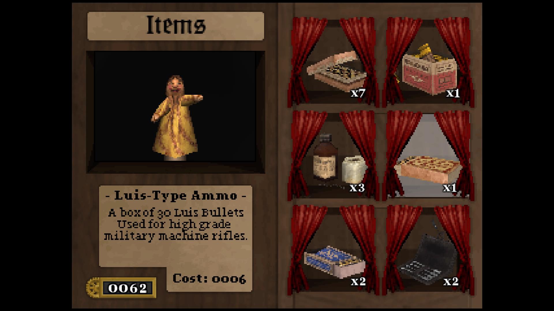 Another great addition is a merchant you can find in save rooms where you can buy ammo, guns and outfits. The different outfits actually have stats to them which can give you additional healing boosts, faster reloads, or increased defense. To buy these items you need toothwheels, which is a currency dropped when you kill enemies. This is kind of a meta game you need to play with yourself as you progress throughout the game. Do you avoid enemies and save ammo? Or do you blow away anything in your path gaining more toothwheels so you can buy better weapons and outfits? There are also special items and weapons you can buy after defeating bosses. You can also buy modifications for Alisa, like giving her the ability to auto aim or puppet strings that will pull her away from danger. Now these modifications are a cool addition but I can't really talk about them in depth. Let's just say it plays into the story and the endings you can get depending on if you have mods or not.