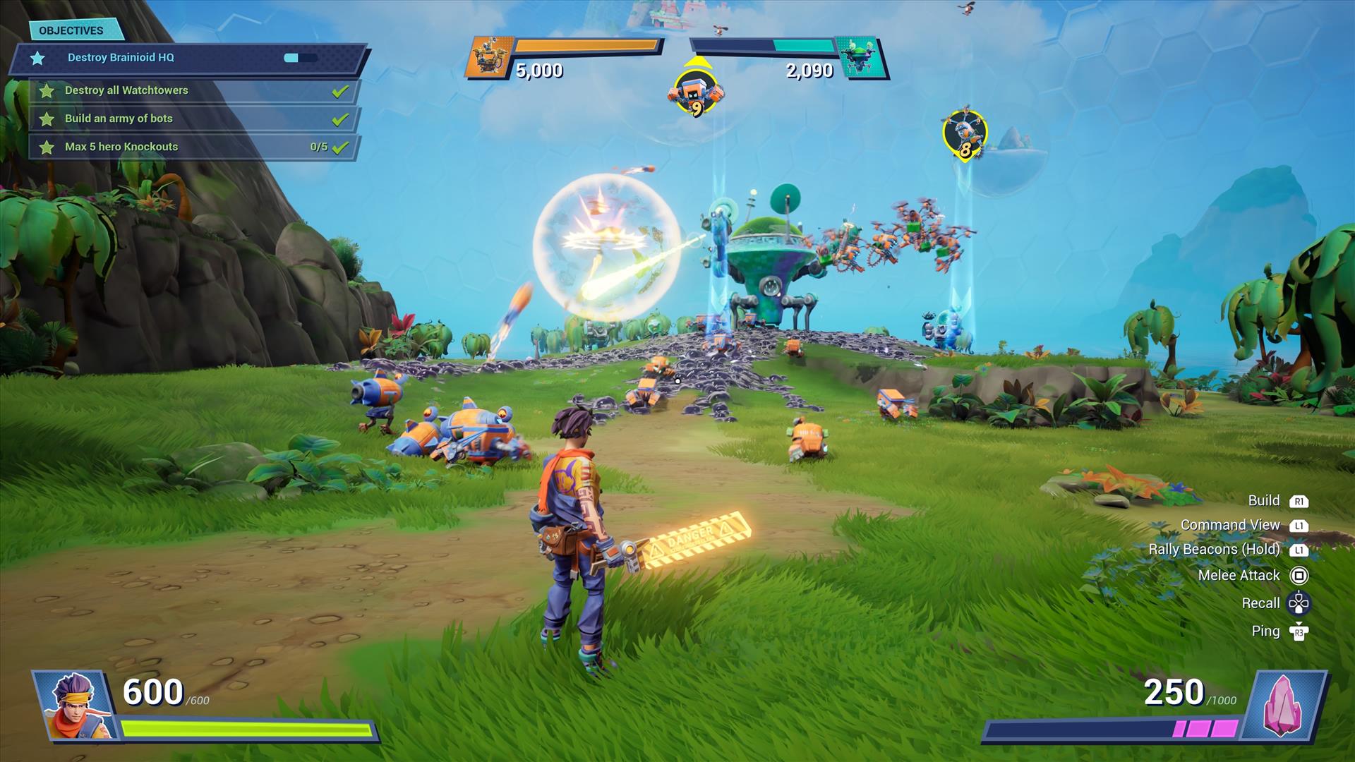 On the contrary, I did enjoy its tower-defense mechanics, which sees you acquiring blueprints for various robot construction structures and placing them strategically on the map. There’s a nice variety of robots to choose from, too. Miner bots collect Brainium, which is required to build or repair anything, but there are also Boxers, Shooters, Flyers, Turrets, Artillery, a Garage, and an Ammo Depot for your guns. There is a limit to how many of each you can place, as well as a limit to how many robots each structure can produce. For instance, a Shooter robot building can produce a maximum of three robots, but if one dies, it will spit out another one for you rather quickly. You can place these on the fly with a button presses, or in Commander Mode, which gives you a bird’s eye view of the battlefield and lets you establish rally points for your entire army, or for each unit type individually. Each robot type has a counter, too. So, for example, if there are a lot of ranged enemies, you need to dispatch a lot of melee-focused Boxer units to take them out. Or if there are tons of enemy structures in your way, lay down some Artillery structures to bomb them from a distance. But once you get the lay of the land and figure out which robots to focus on for each mission, that’s pretty much it.