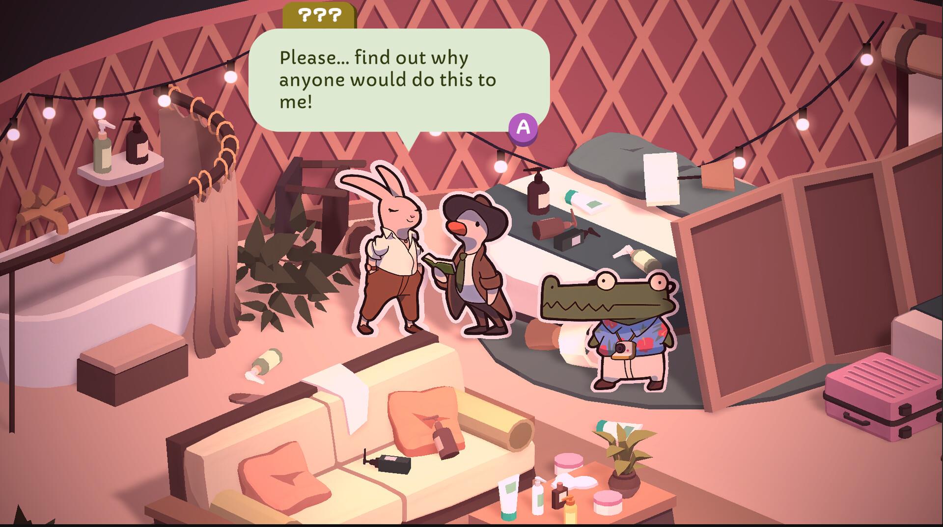 The game continues as such, as you explore new areas, meet new furry characters, and learn about their quirks and what brought them to this interesting campgrounds in the first place. As you explore, the story builds, and you eventually get to the final scene, where McQuackin is able to reveal everything he learned, and you sit with the satisfaction of knowing that you, too, could be a successful Duck Detective, if only you were born with a beak.