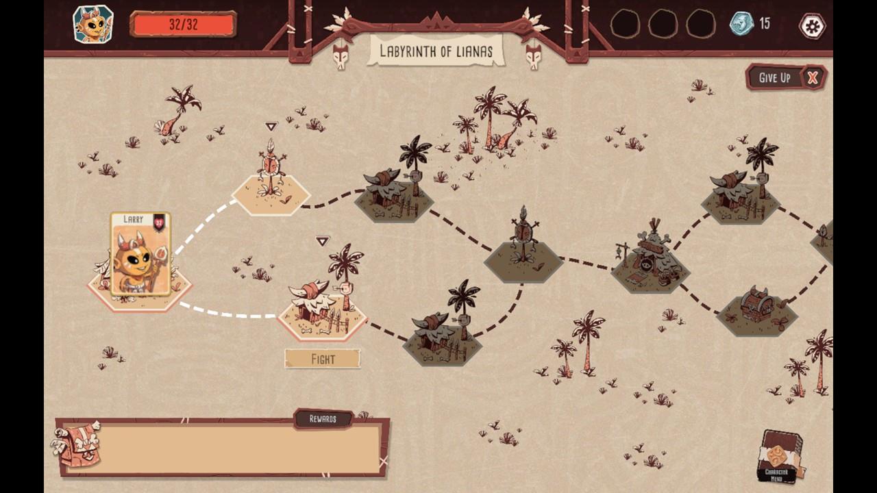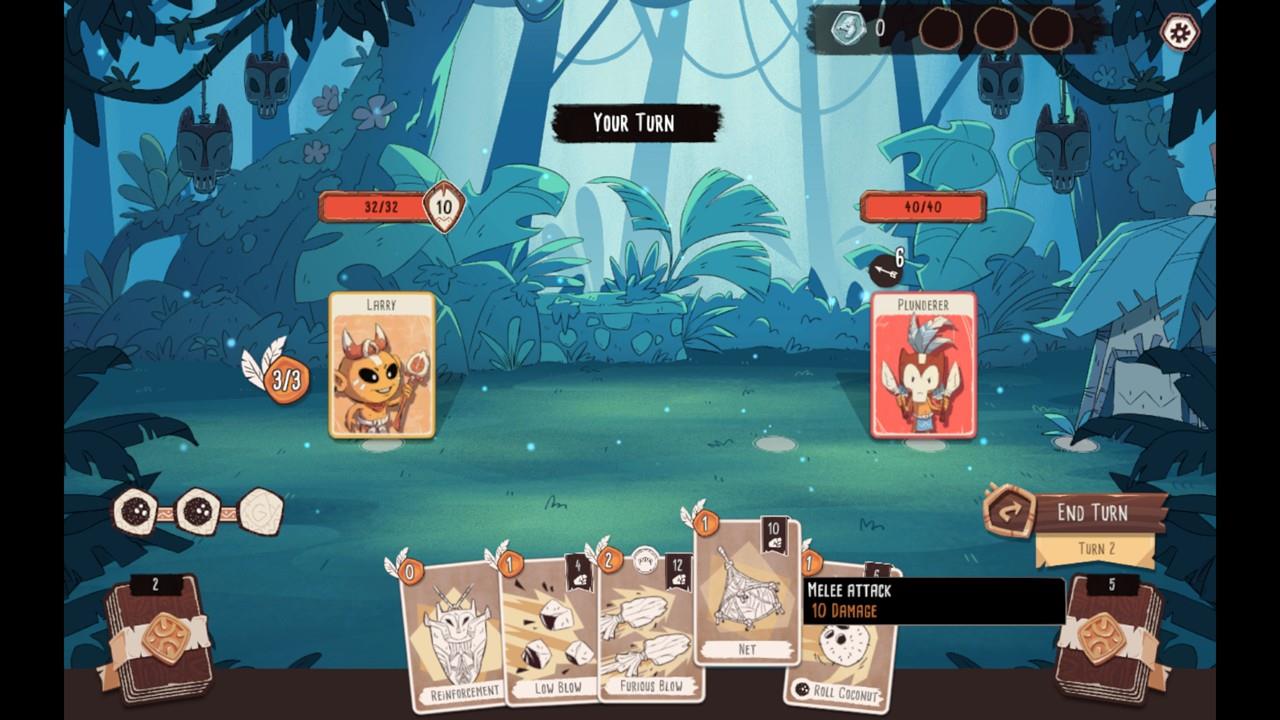 But the evil god isn't your only foe. Throughout the game, you'll also uncover different islands to explore, requiring classic deck battles to see if you can hang on to your HP long enough to survive and reap the rewards. This creates a fun little break in the game that allows me to pause and mentally stretch. The further you venture through the exploration piece, you'll also have to use your resources to access certain islands as well, like building a bridge to reach the jungle boss.