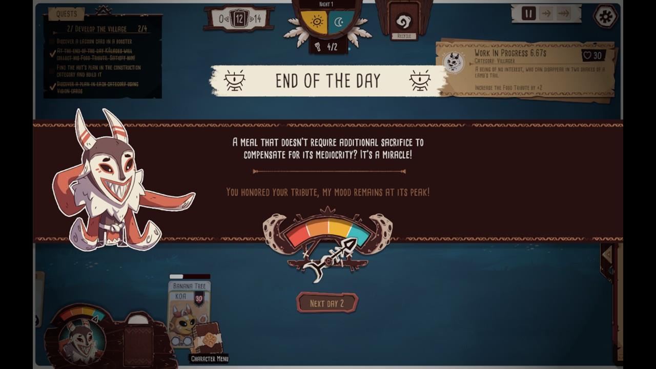 The days are short. Just as I was developing a strategy, it was the end of the day and I didn't feed the god. I felt like I only had time to focus on either feeding the god or building my village, but never both. I'm sure as I continue to play this game, which I will, I may figure out the tricks to allow myself more space for strategy, but in the moment, I felt constrained and frustrated that I couldn't put more thought into the game since there's a severe ticker keeping me on pace.