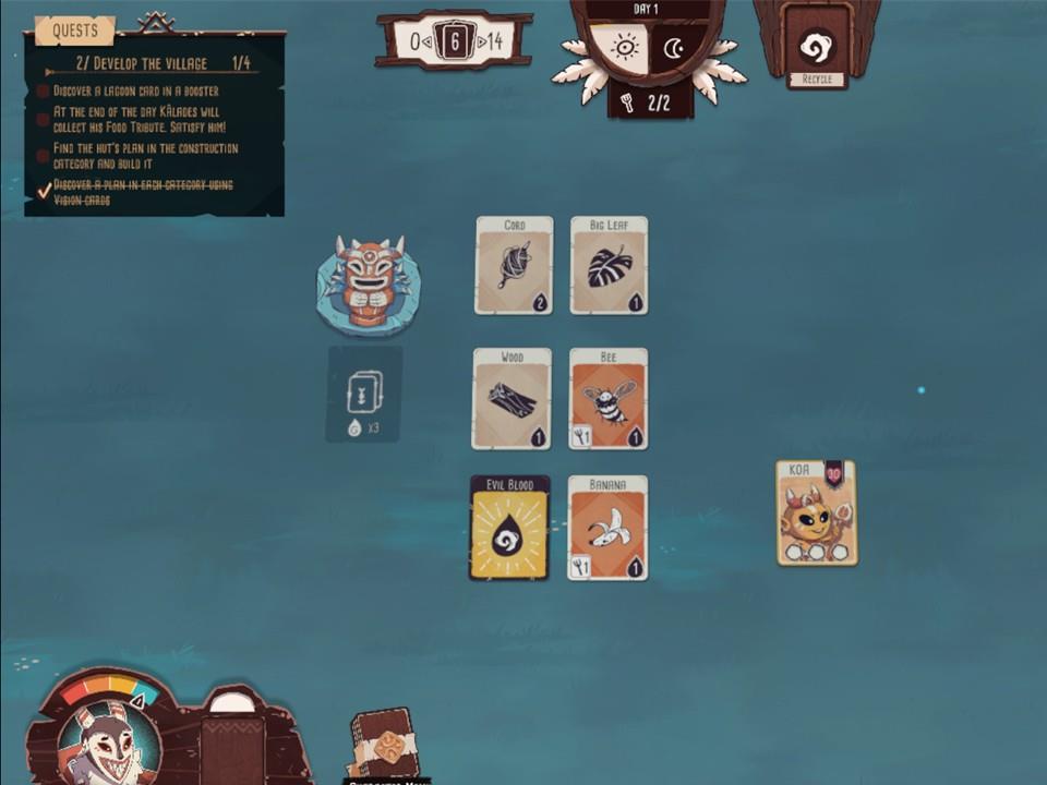 The problem (specifically my problem) lies with the need to appease a god. At the start of each day, the god demands a certain amount of food, and it's a part of your day to uncover, or create, the amount of food needed to meet the growing demands of your god. If you come up short four days in a row, you lose a tribe member to a sacrifice. If you're early on in the game? Game over. There's a countdown clock that shows the progress throughout the day, so you know when to start sweating as you open booster packs in a manic search for maggots.