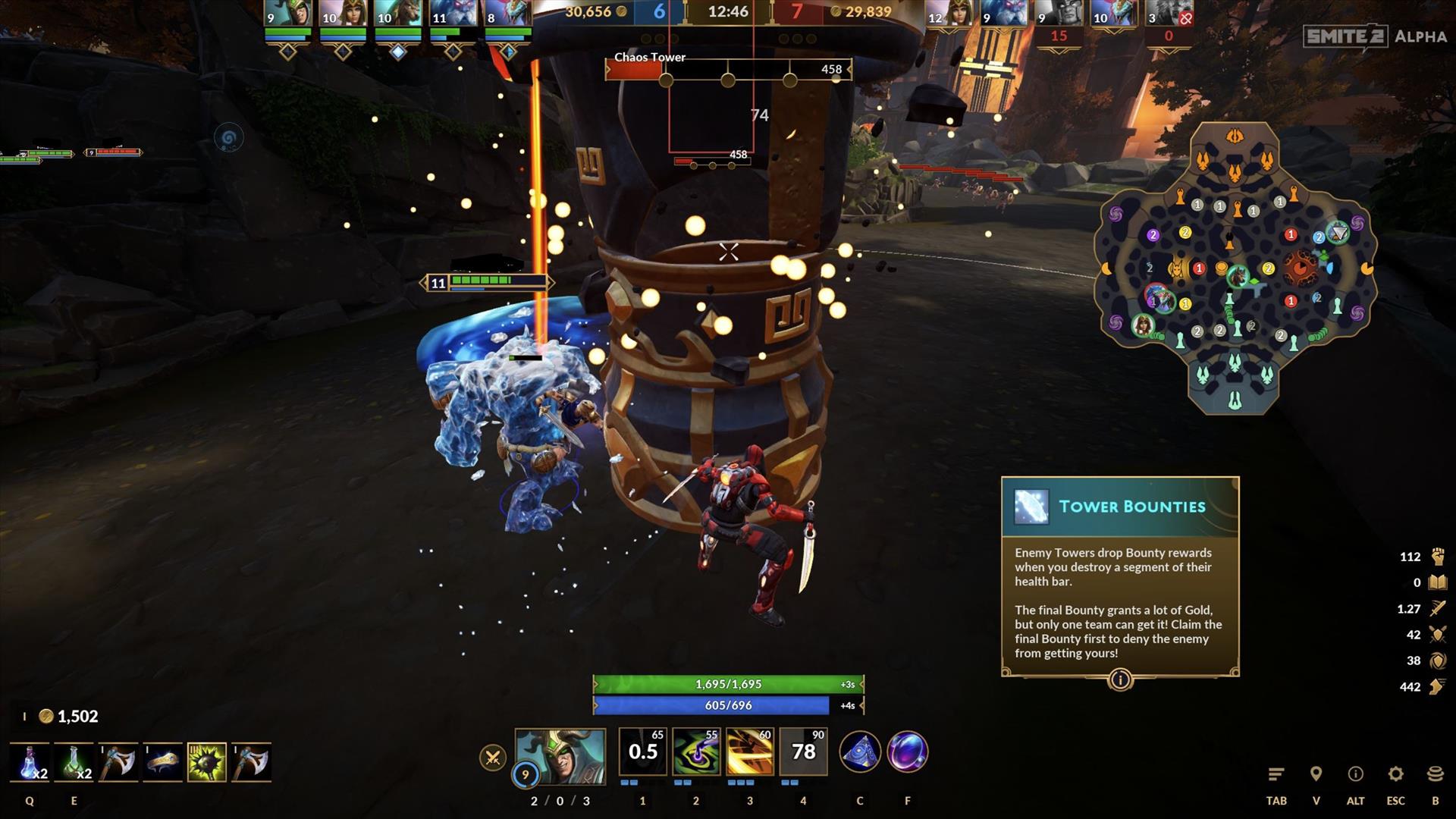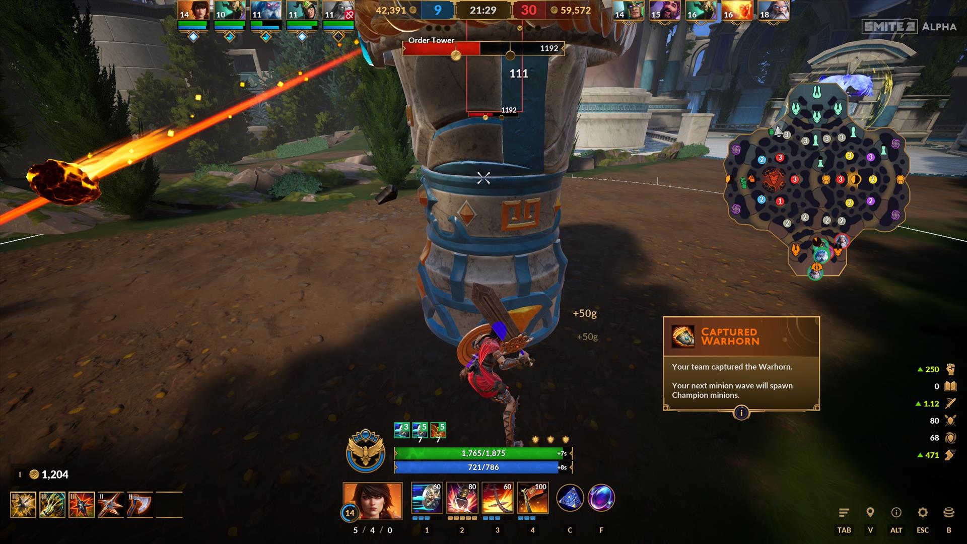Now there are two big criticisms I have and something I really hope changes by the time the game launches. The first is that I feel the game is way too slow and not just how long it takes to complete a game. It seems that every part of the game has been slowed down compared to the original SMITE. From movement, to attack speed, lane clears, activating abilities, everything just feels like it's moving like a YouTube video that was put on 0.75 speed. It's not totally unplayable, but something does feel... off about it. Maybe it's just because I have been playing the original game for 10 years now and this very well could just be that it's alpha and something that will be fixed in later updates, but it was this weird feeling I couldn't shake off, especially with Chaac's axe throw. In the first game I know exactly where that axe is going to land and can connect with it almost every time. With SMITE 2, I was missing it so much because by the time it leaves Chacc's hands to the time it hits the target feels like an extra second and that second really matters.