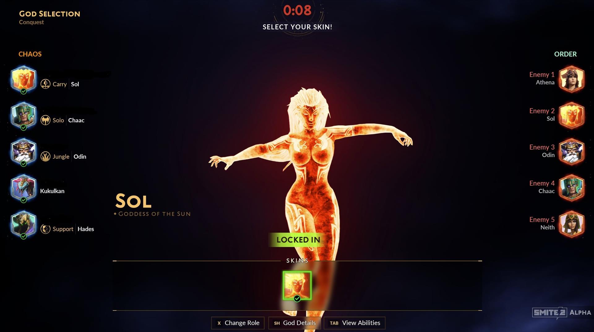 Another change which is nice for long-time SMITE players is that almost every god in the game got changes to their kits. There were 16 gods available to play in the alpha period. Anhur, Anubis, Athena, Bacchus, Bellona, Cernunnos, Chaac, Fenrir, Kukulkan, Loki, Neith, Odin, Ymir, and Zeus with Hades and Sol added in the second alpha. Most of these characters retain most of their original abilities but gained new ones, such as Ymir's wall now being able to damage enemies, Sol being able to build heat using any of her abilities, Athena being able to dash instantly, Kukulkan being able to dash away quickly when in one of his tornados and Loki instantly going into stealth once he gets a kill. As a longtime player of the first game I absolutely love the changes a lot of these characters have gotten and makes the game feel fresh and not just a rehash of the first game. It makes me extremely excited to see what changes the other SMITE 1 gods will get when they make their way into SMITE 2 and I feel like this is an opportunity to give some original characters some reworks to their kits.