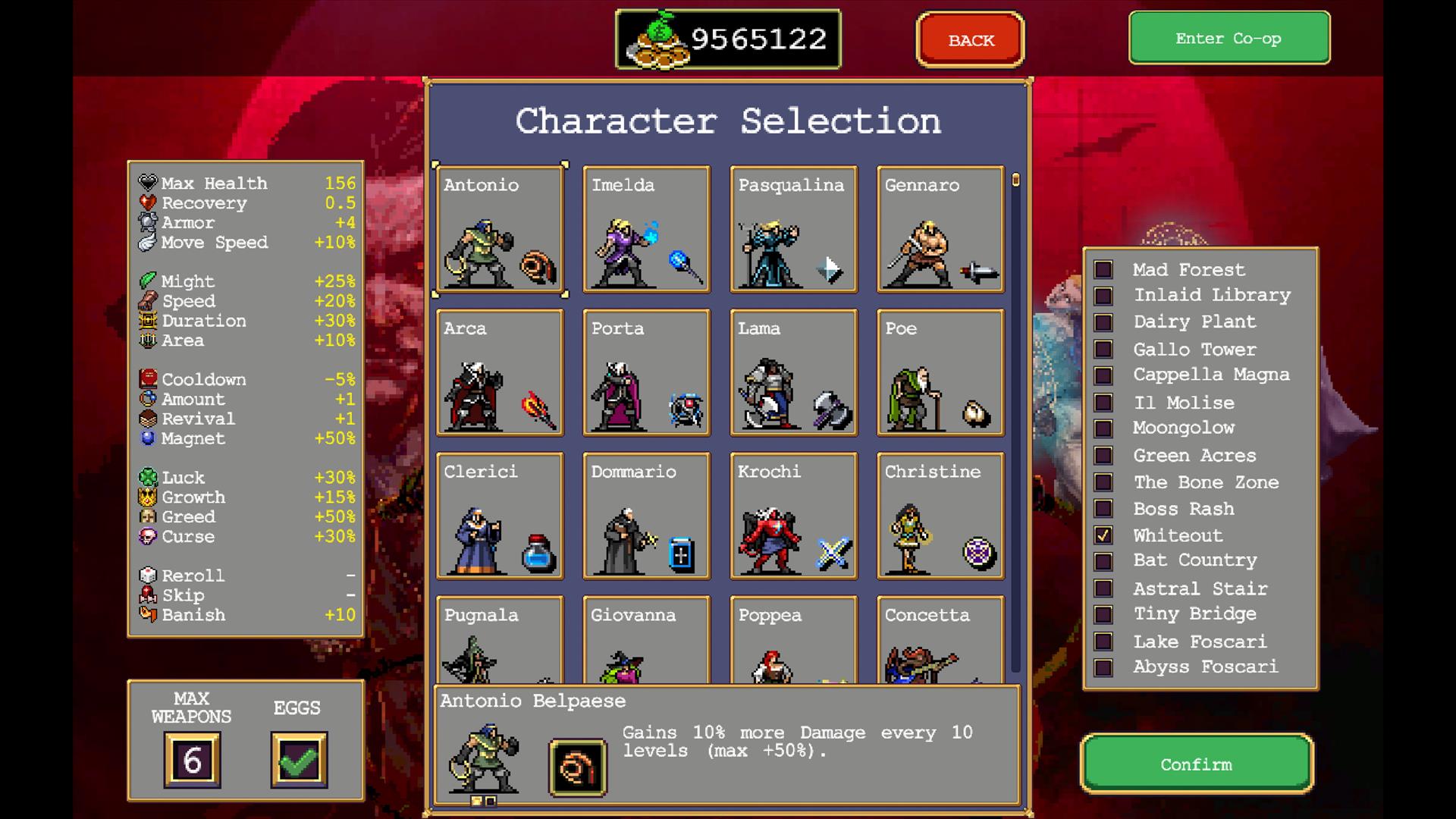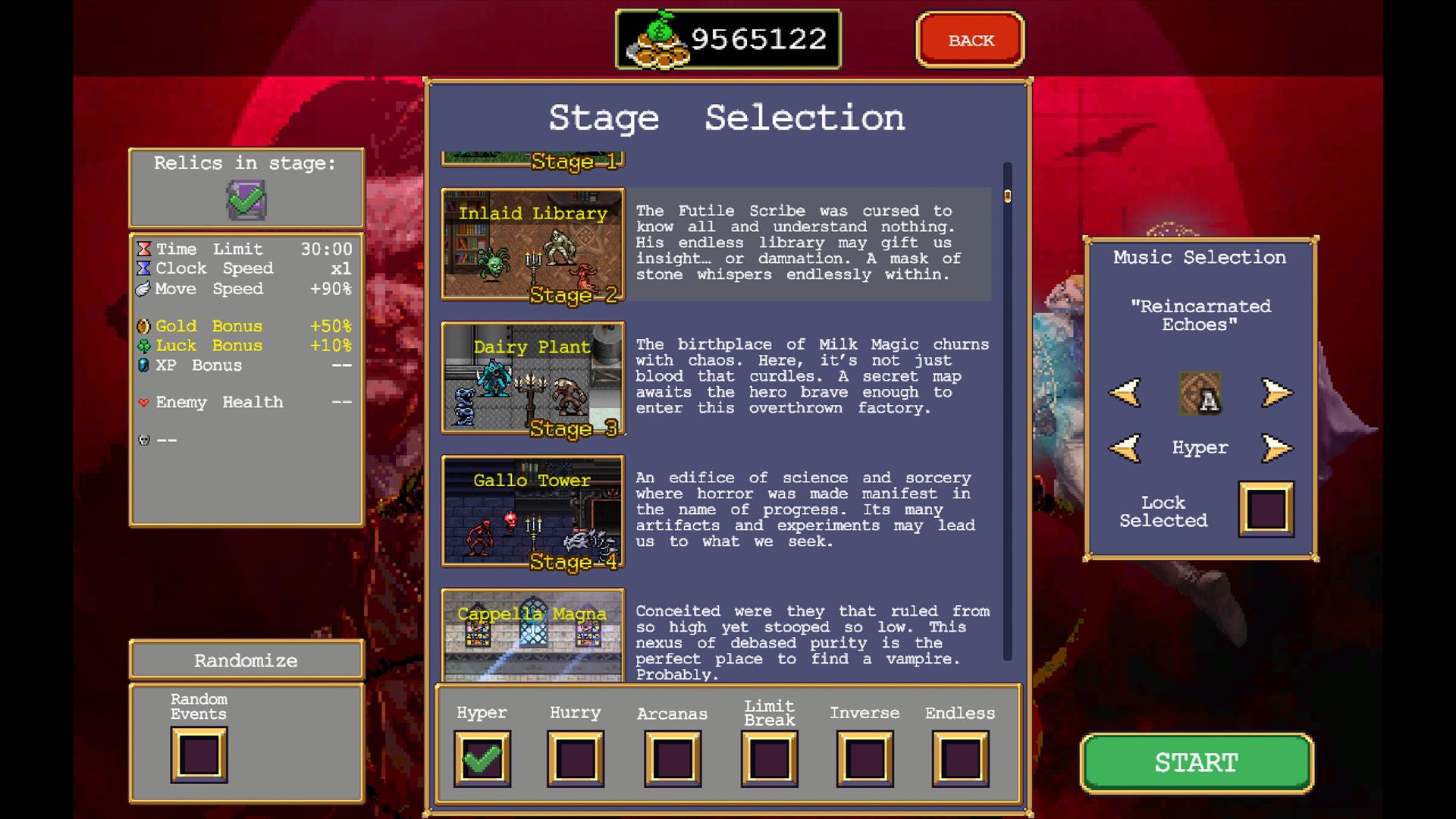 It all comes together in an excellently paced package. The game does not require fast twitch skill, but does need a bit of knowledge and strategy to power up a given run. Vampire Survivors does not just vomit out everything you need to be successful at the go, but clearly shows the path required to unlock the treasures required. Every step is clearly laid bare in the menus to pick the few goals you want to strive for on each run. Once you get a taste of success it's up to you how far you want to take it. Conquer each level's map or with each of the thirty or so characters in the base game and more across all the DLCs? There are tick-boxes on each character to track that progress. Unlock every item, powerup, and curse in the game? Go for it, the path is clear.