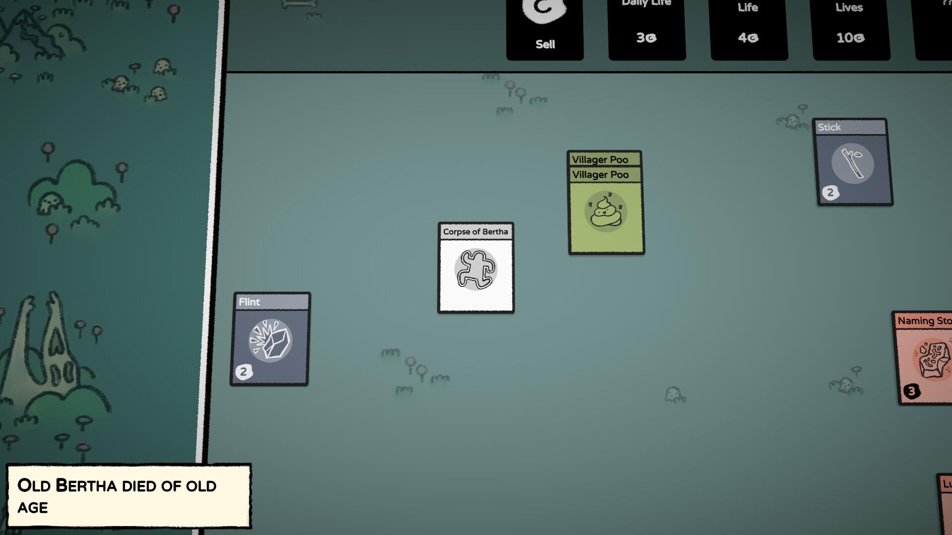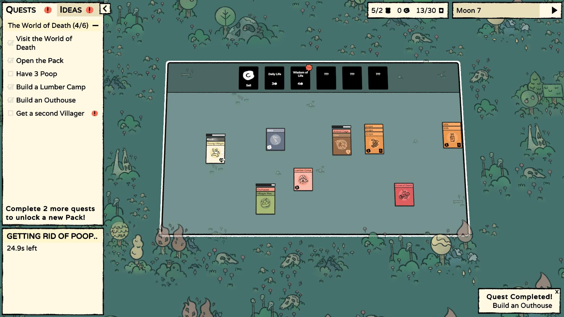 I nearly gave up on Stacklands before I really even began, but I am glad I pushed through. The game opens with a sort of a tutorial. It's not a tutorial really, it's the first steps of full play-through, but you are directed on the left side of your screen through what early game progression looks like. Pick some berries, punch a rock, sell the stone for coins, cash the coins in for a new card pack, open the pack... Each step is an item in your Quest checklist that only reveals once you accomplish the one previous. Until you reach the limits of the screen space for the list and you need to scroll, then what do you do?