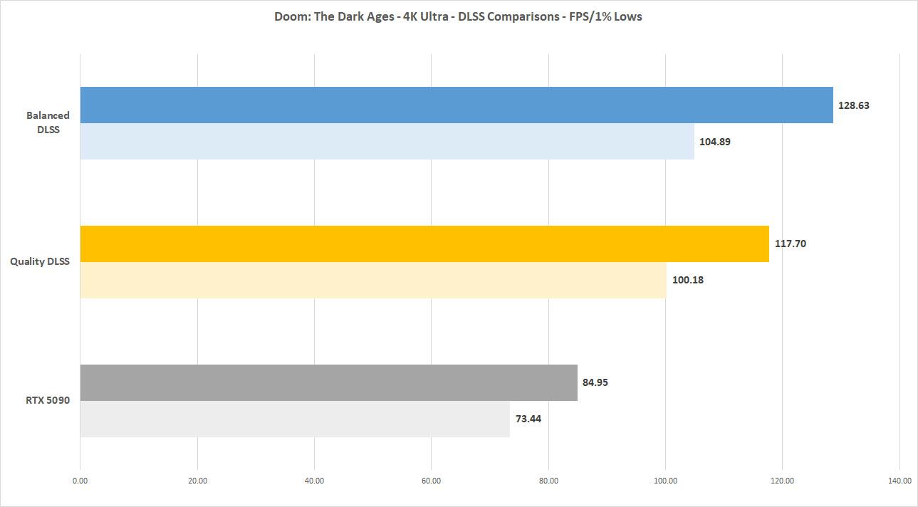 Unlike Doom Eternal, which ran really well on most cards and is highly optimized, Doom: The Dark Ages’ requirements entail a beefier card. Here running at 4K, we’re averaging 84.95 frames per second with a 1% low average of 73.44 fps. It’s not an apples to apples comparison considering Eternal runs on id Tech 7 and was done five years ago, but that game would run in the mid to upper 200 fps with the same setup. That’s not to say Doom: The Dark Ages runs bad on the RTX 5090 since there are many changes to the engine and the ray tracing requirement. But if you want to know how the two compare, there you go.