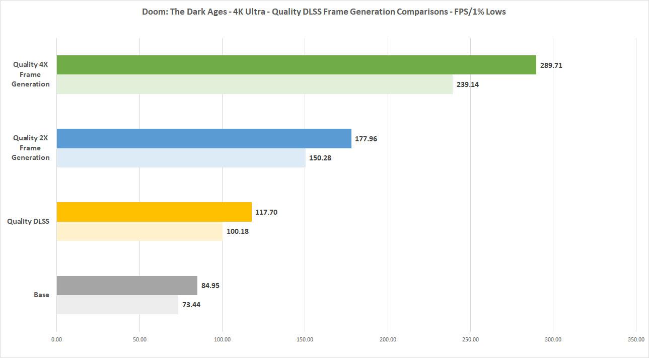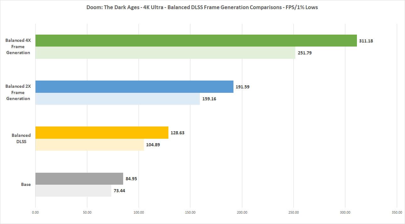 But those with even higher refresh rate monitors might want to turn on frame generation. Here’s how it runs when using either 2X or 4X multi frame generation along with DLSS.