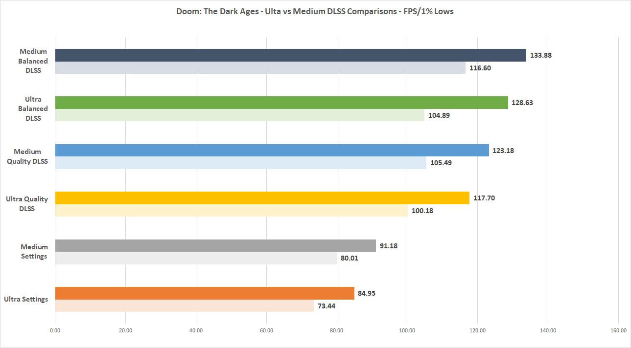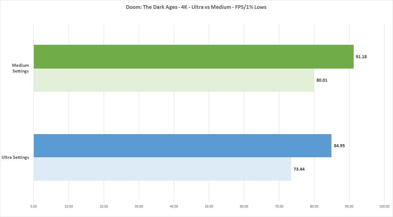 Finally, I wanted to see the difference between Ultra Nightmare settings and Medium settings in the game. After playing it on both for some time, it’s hard to tell any difference between the two in terms of image quality. As such a fast paced game, it might be beneficial to just run at a lower setting to get as much performance out of it as possible without sacrificing image quality. Here are the two baseline scores compared to each other.