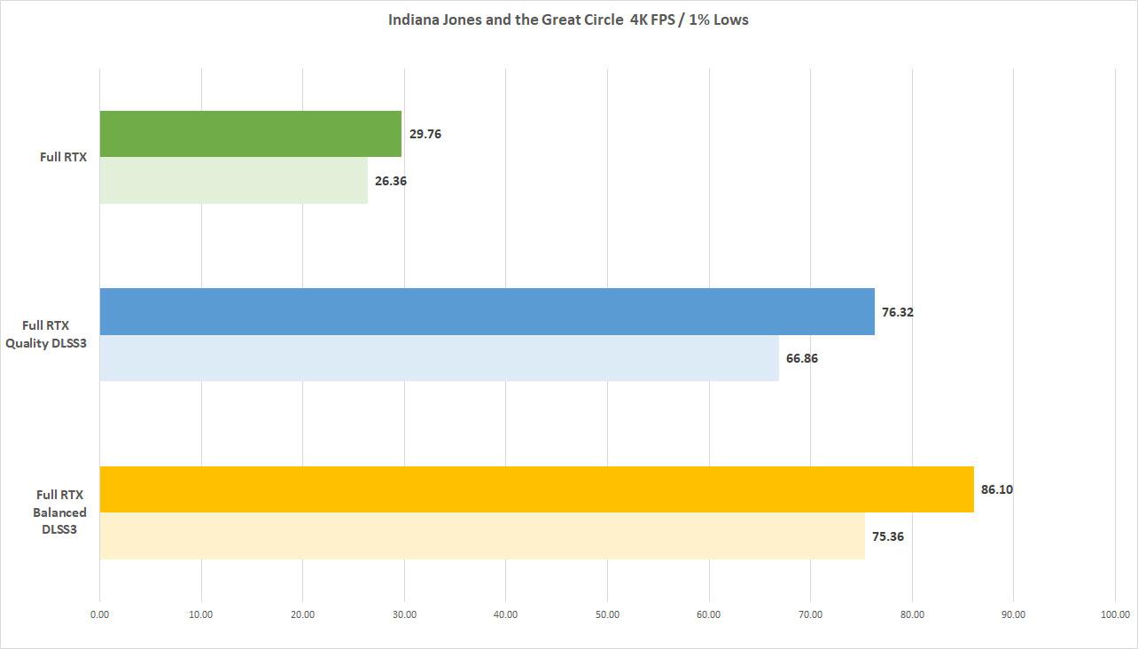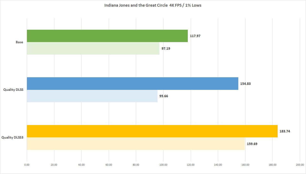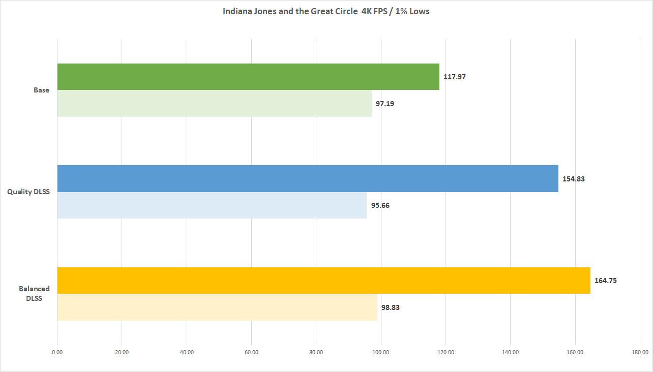 Indiana Jones and the Great Circle plays really well without RTX enabled on the GeForce RTX 4090, but even Full Path Ray Tracing can drop the performance on this monster card when enabled at 4K. With DLSS and Frame Generation, you can get back a lot of the performance and get a great visual experience as well.