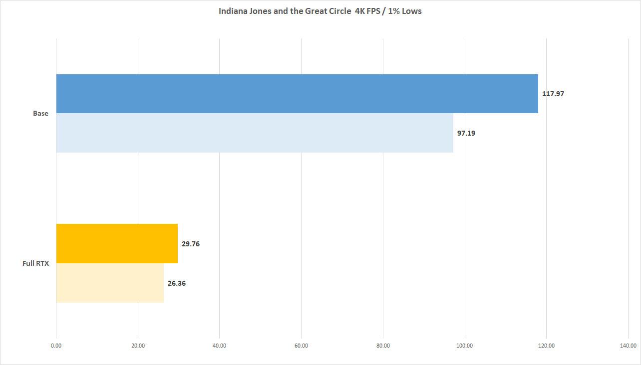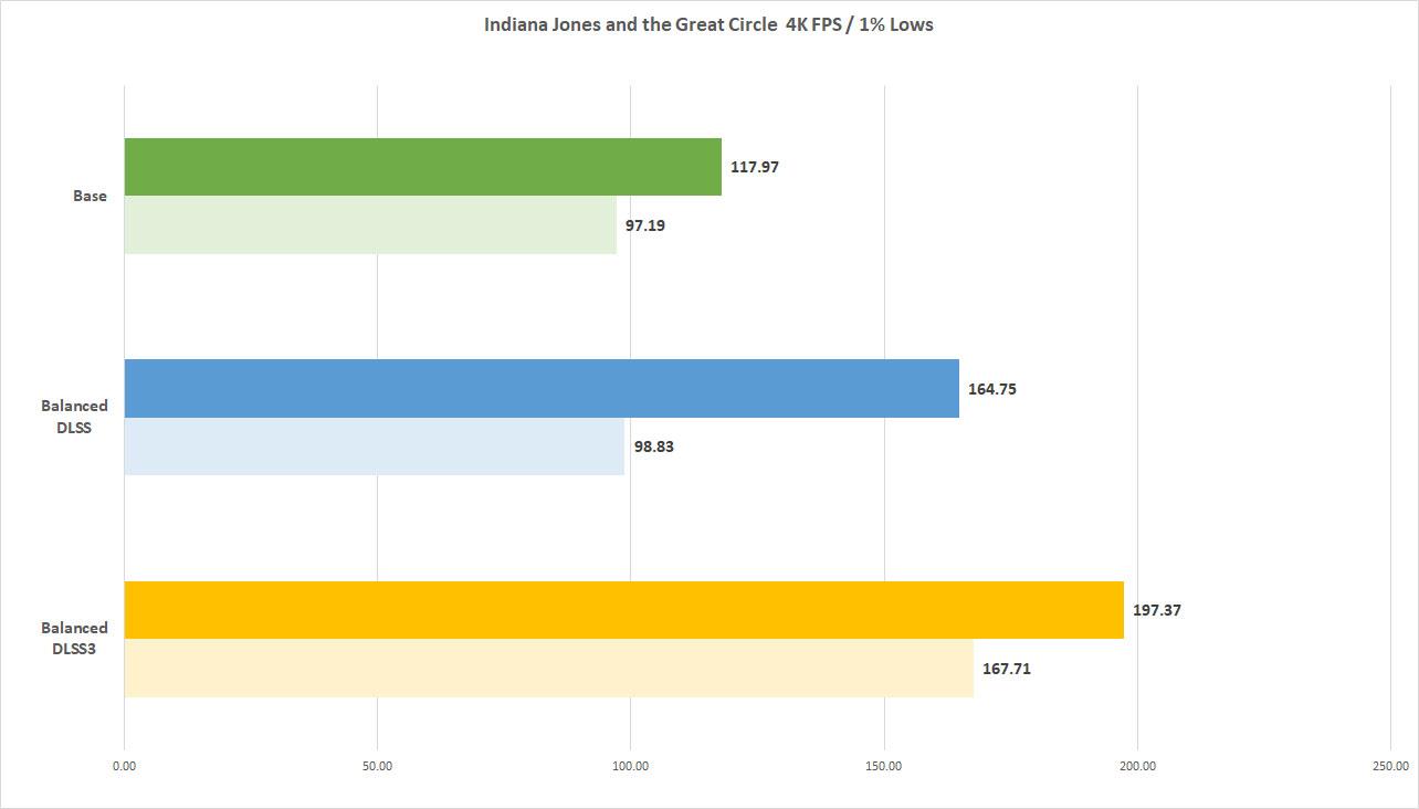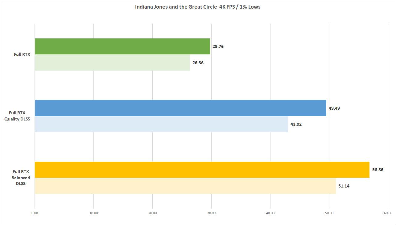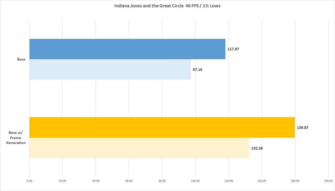 Indiana Jones and the Great Circle plays really well without RTX enabled on the GeForce RTX 4090, but even Full Path Ray Tracing can drop the performance on this monster card when enabled at 4K. With DLSS and Frame Generation, you can get back a lot of the performance and get a great visual experience as well.