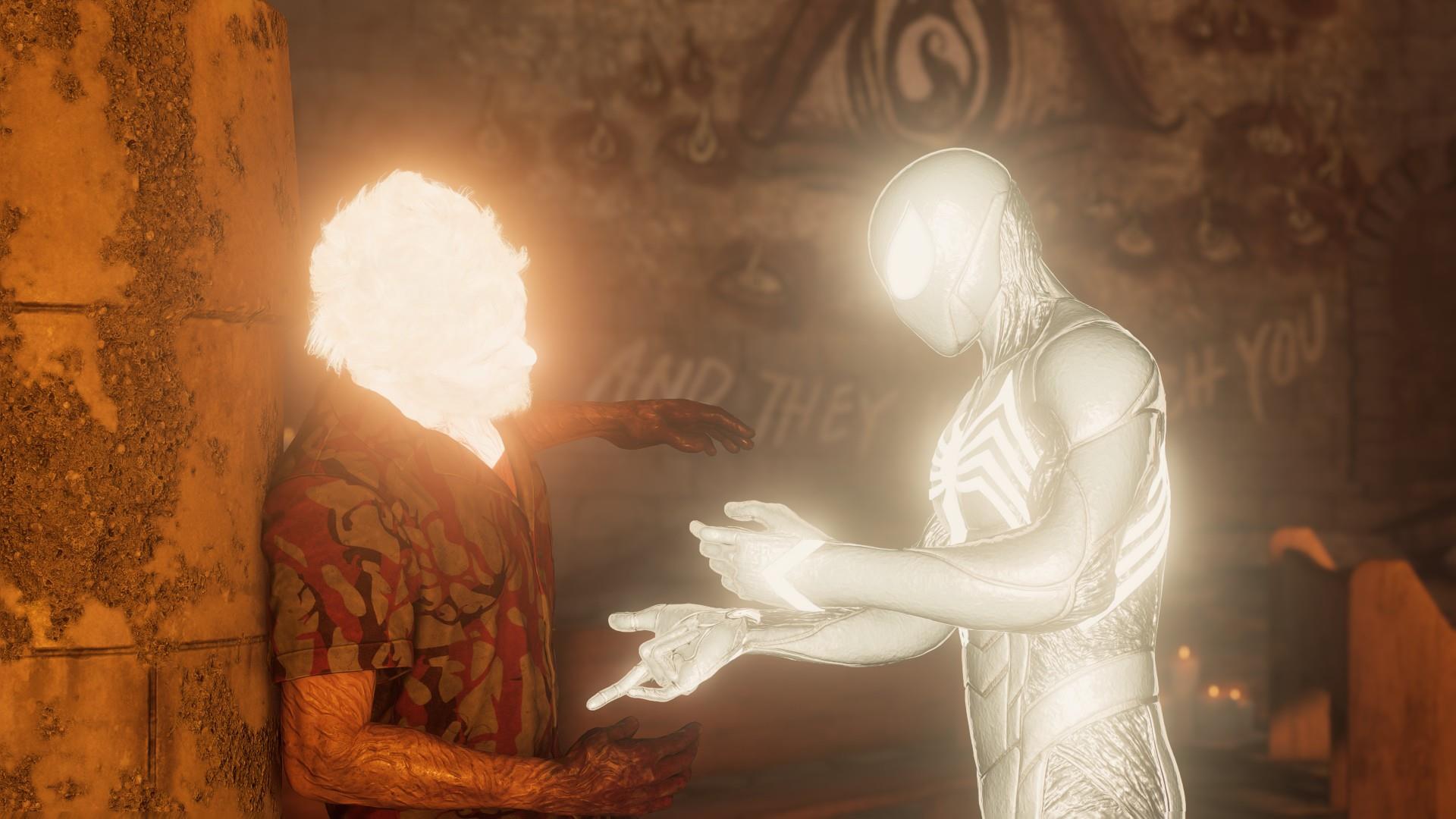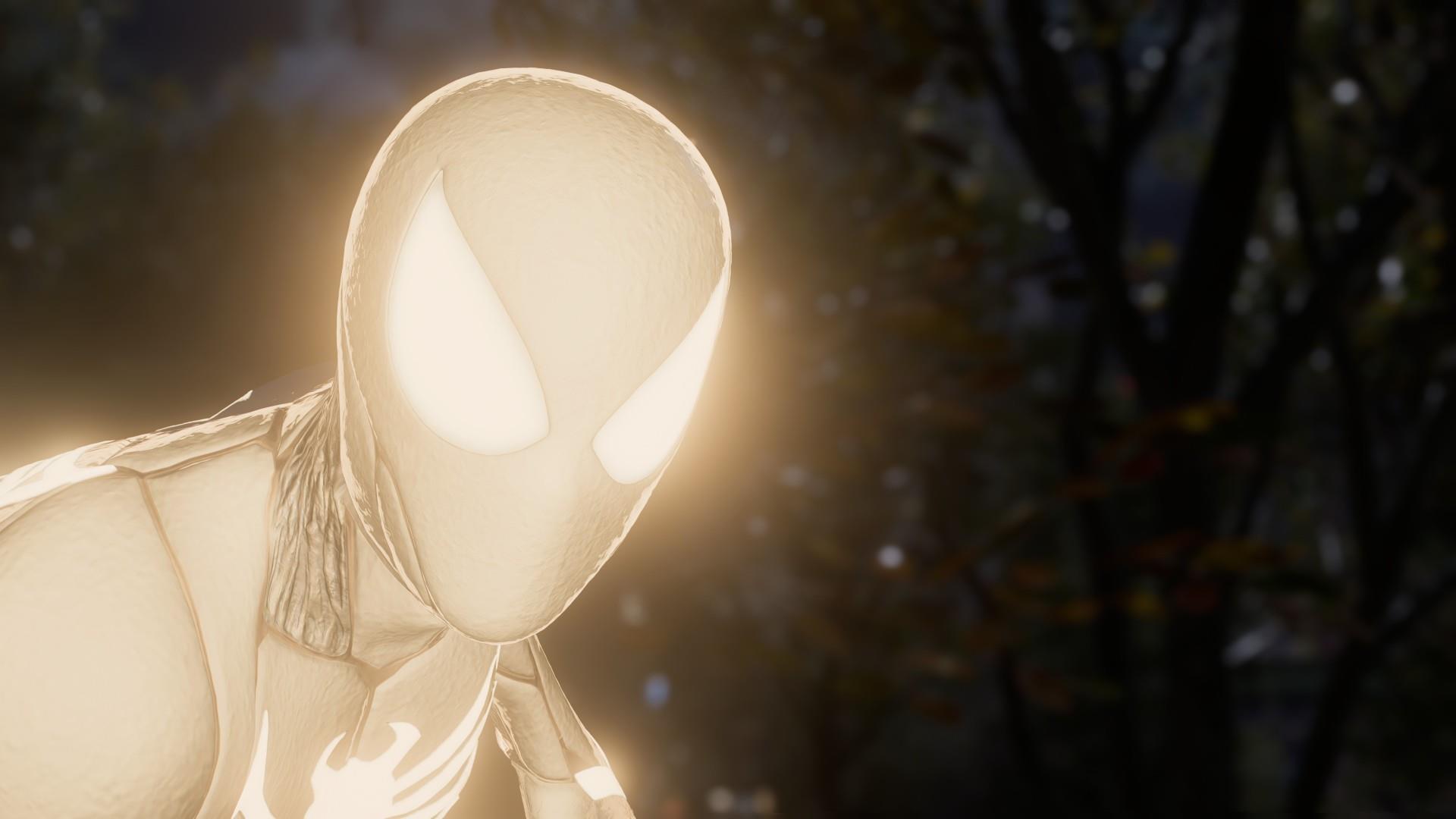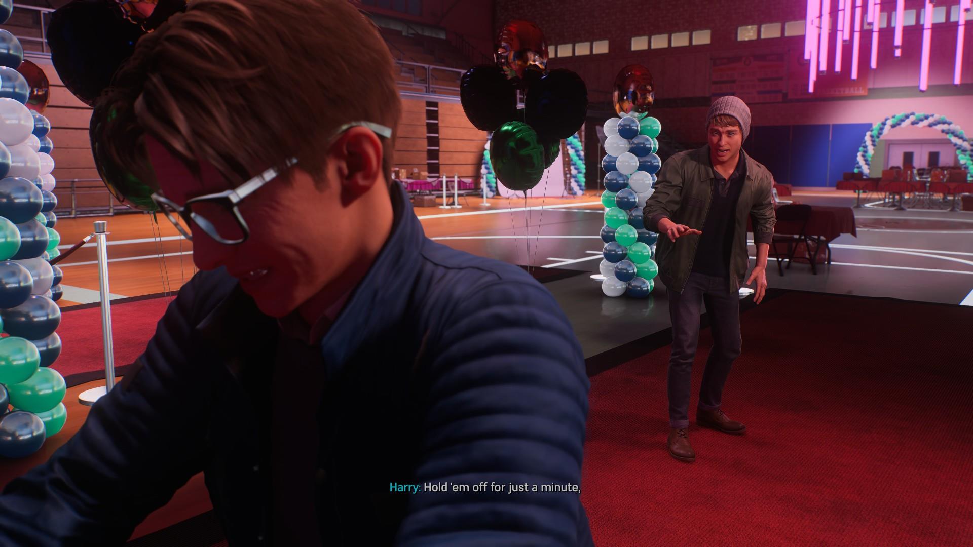 There was another glitch I came across where certain parts of Peter or even entire bodies would just be bright white. In a cut scene showing Peter in the past breaking into the high school with Harry, Peter’s glasses would sometimes be completely white, but you could still see the details of the frame. As Peter moved, it would bounce back and forth from black to white, making it really jarring to watch as you would see these really bright white glasses on Peter.