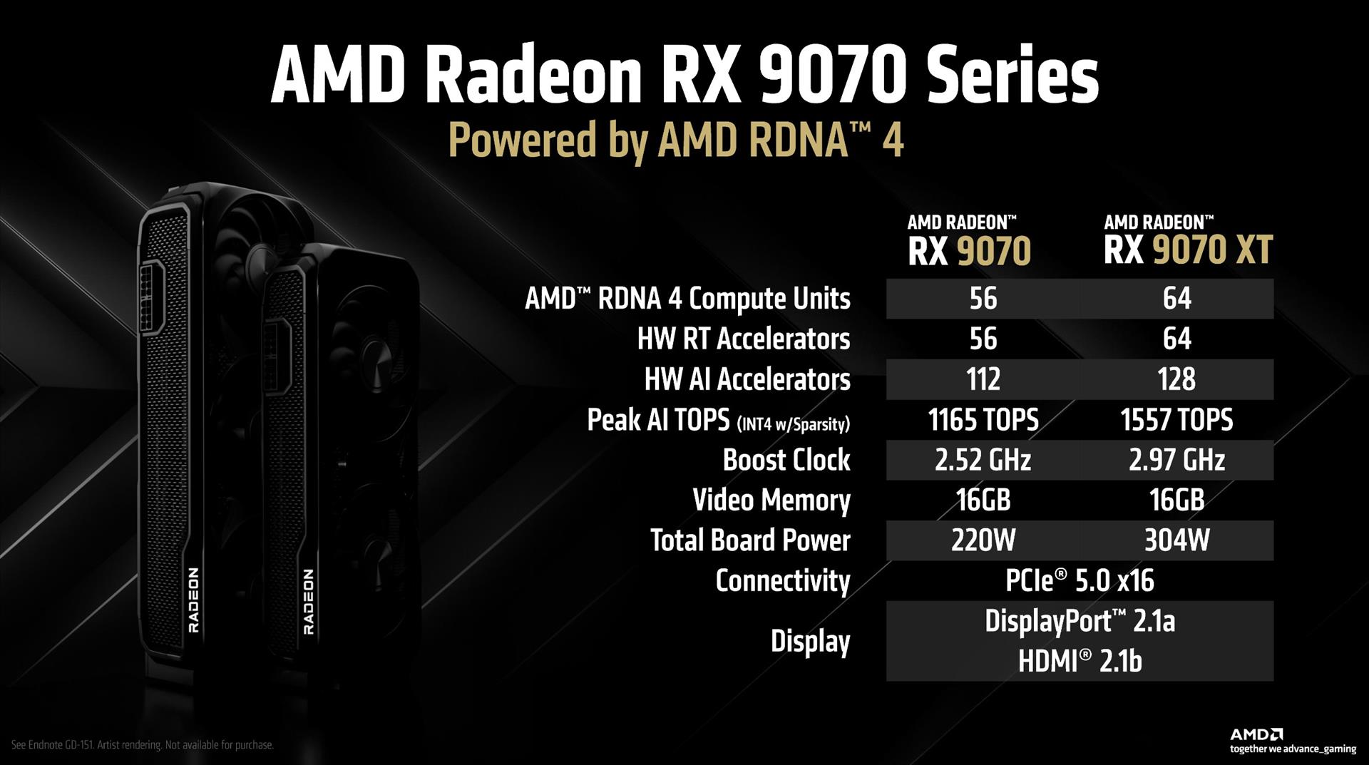 From the chart below, you can see the differences between the RX 9070 and the RX 9070 XT. The RX 9070 will have 8 less RDNA 4 Compute Units, 8 less HW RT Accelerators, 16 less HW AI Accelerators, and clocked a little bit lower. It does also have a lower TGP at 220W versus the 304W of the XT version. But, both cards do come with 16GB of GDDR6 VRAM with a bandwidth of 20 Gb/s. I know the public wants more VRAM in these cards, but AMD feels 16GB is more than enough for 4K and 1440P gaming.