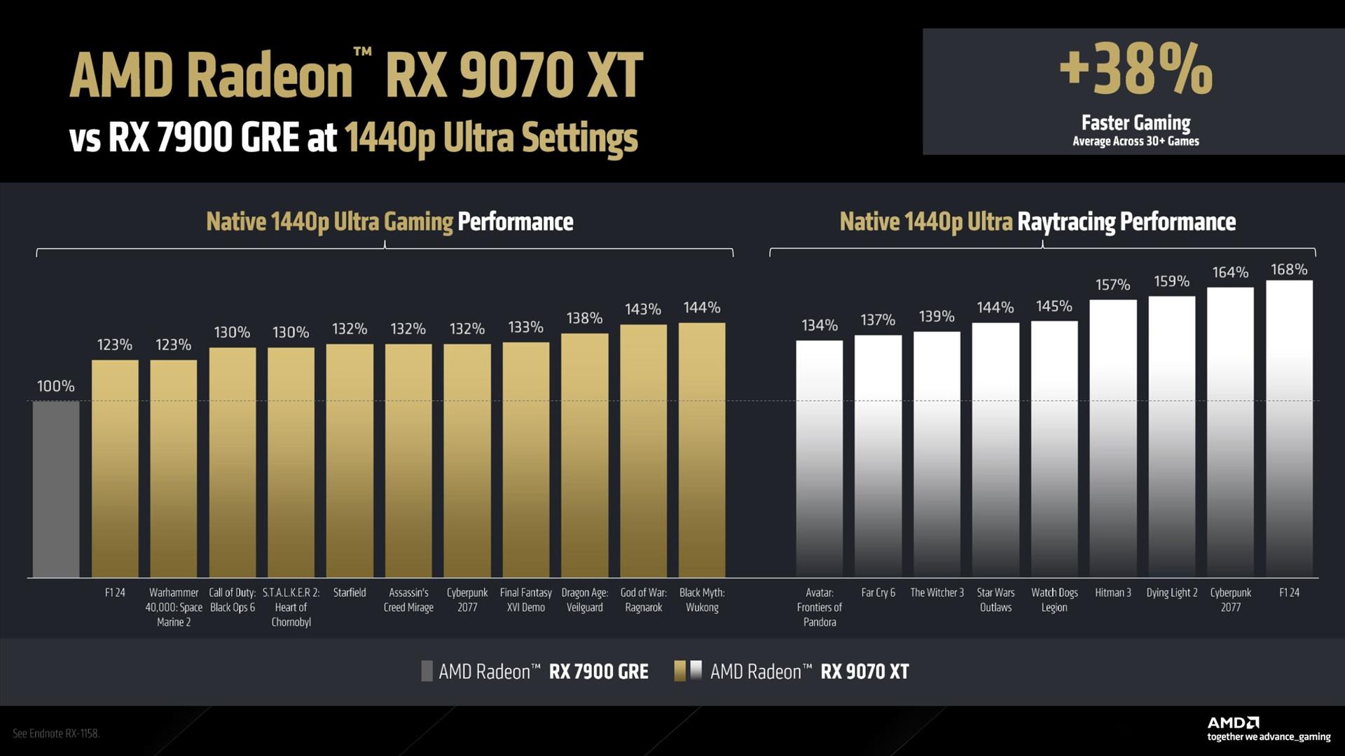 Going to the RX 9070 XT, AMD claims it’ll also be 26% faster on average, but this time over a GeForce RTX 3090. Compared to the RX 7900 GRE, we’re talking on average a 38% uplift and a 42% uplift in 1440P and 4K gaming respectively.