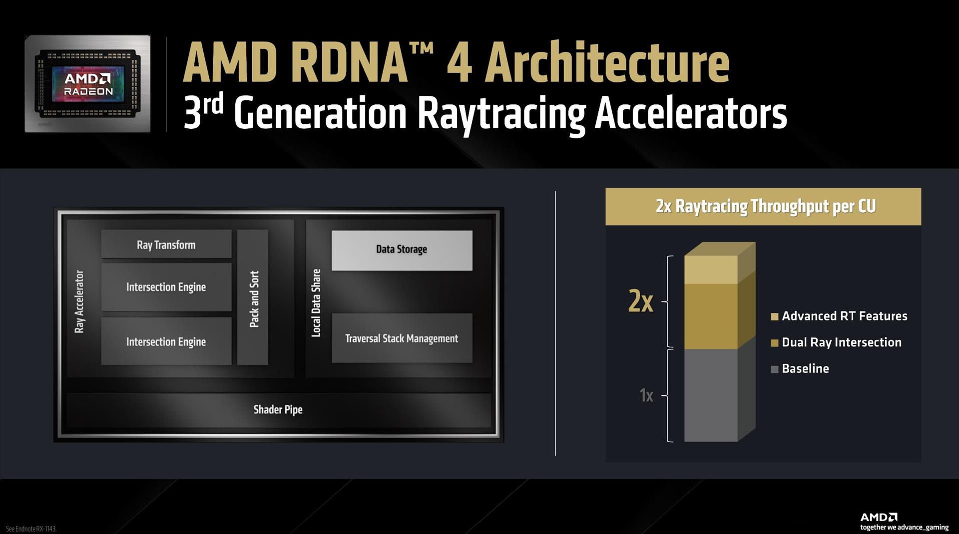 AMD says their two RDNA 4 cards are about 40% faster than RDNA3. Along with improved rasterization speeds, AMD made improving ray tracing one of their main goals for this generation and added a second ray intersection engine to help with that goal. With a dedicated ray transformation block, AMD thinks they have doubled the throughput of their ray tracing capabilities.