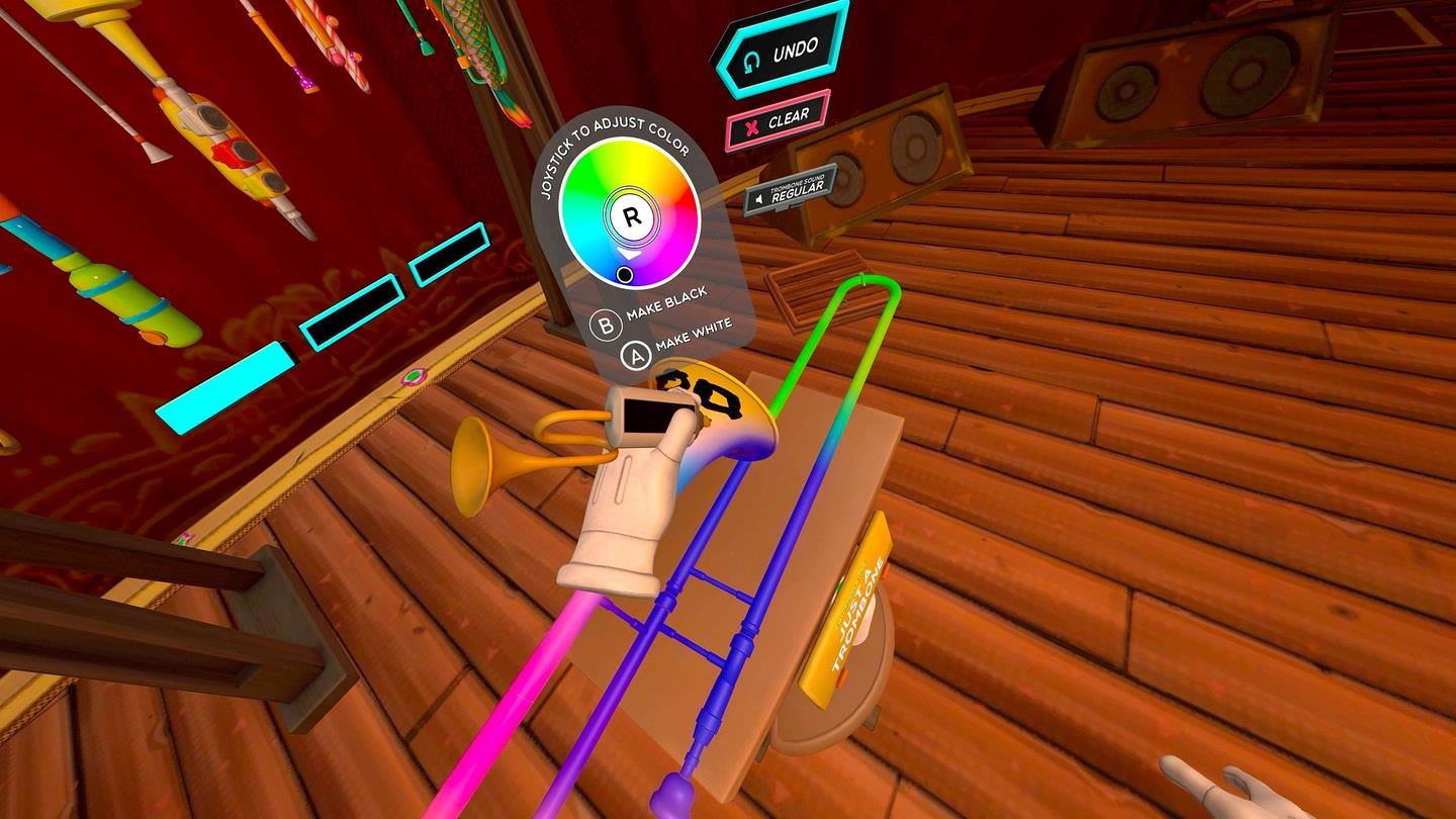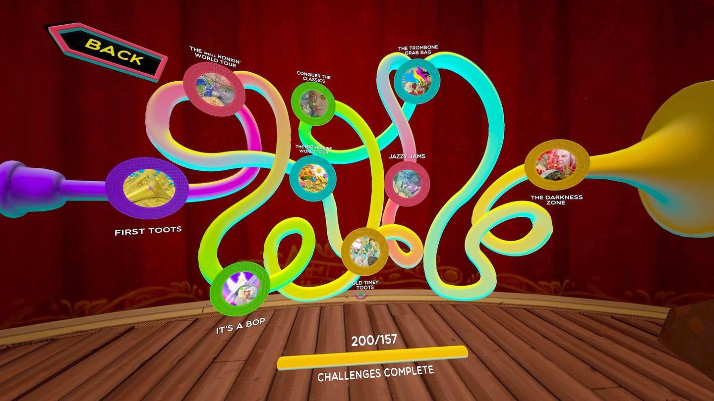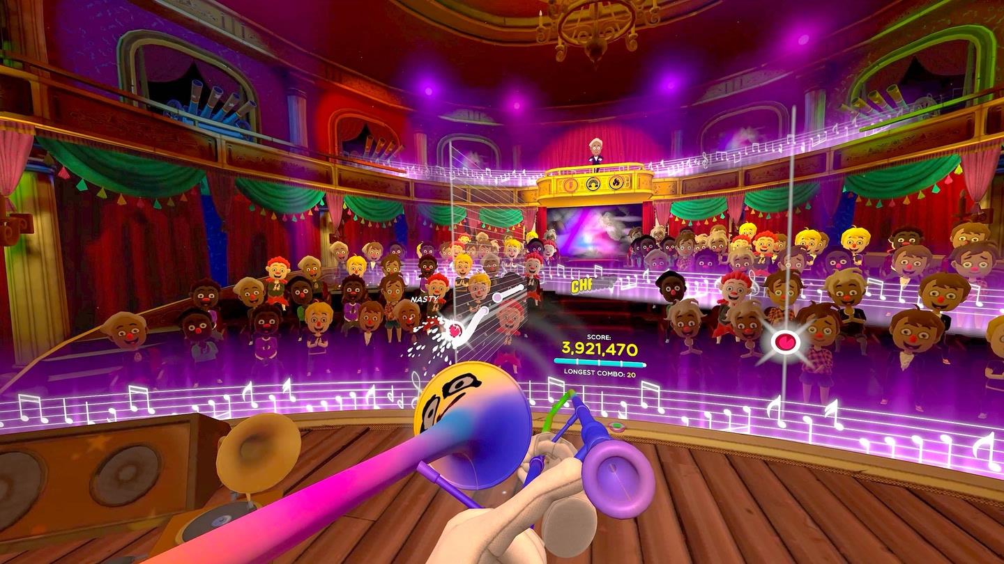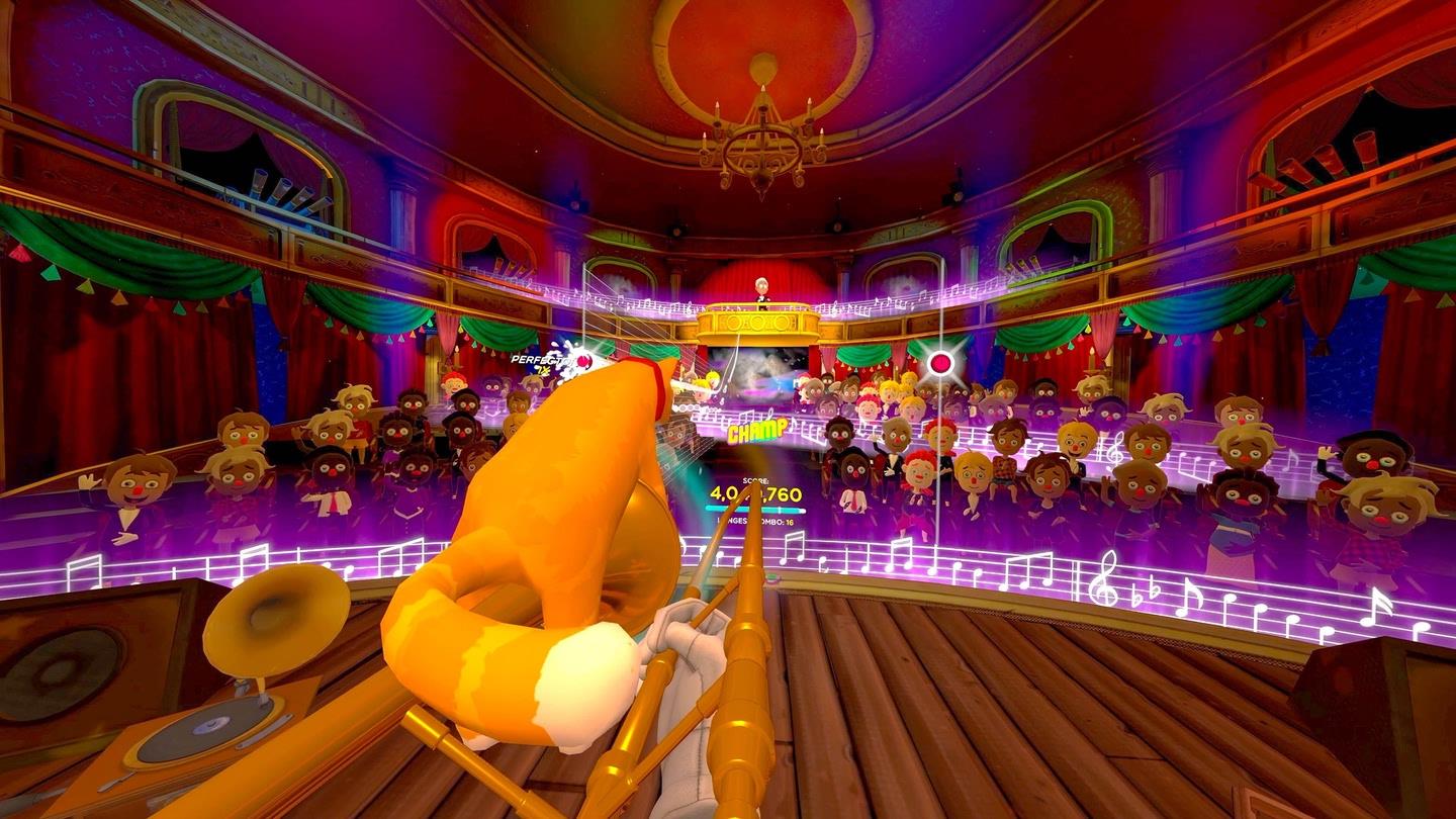 Since release, the game has been updated with more perks, such as uploading and making your own track, complete with tutorials, and even letting you try out any song you want in free play. Pitch assist lets you hit all the notes without penalty, but no one wants that. Bad tooting, all the time, I say! There are more trombones to unlock, and more theaters you can play in, like a New Year's themed one. You can play the game in mixed reality too. I do think it's very fun, but you are going to need some patience for that first hour or so. Once you're past that, you can toot your own horn for as long as the game is supported, which seems to be a long while from now. And no, you cannot play it with a real trombone. I tried, and I can't play AND hold the controllers. I'll find a way, I suppose.