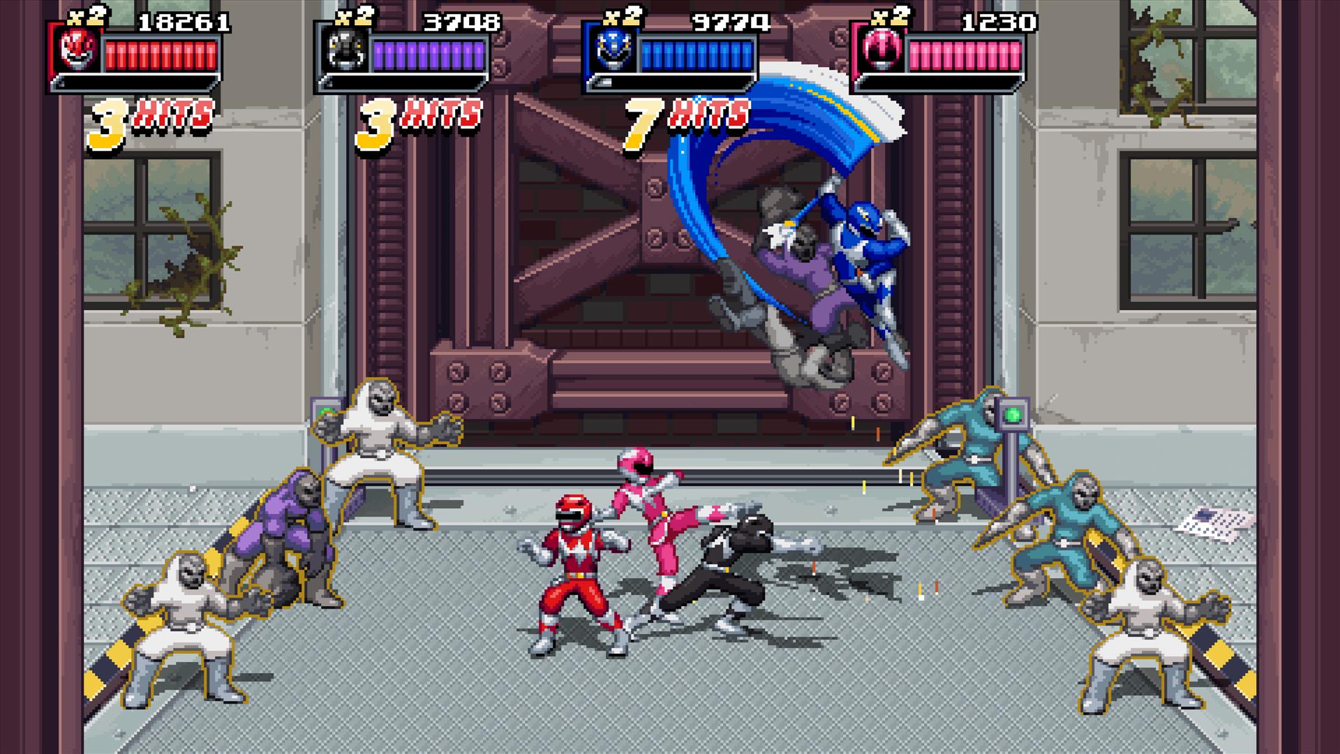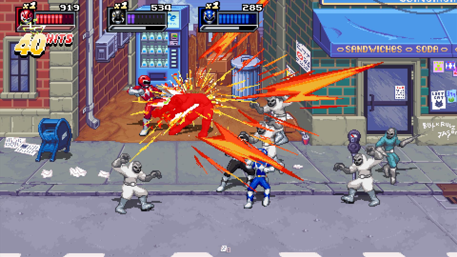I'm going to say that the rangers, are slow. They all share the same move set. Punch button presses lead to combos, and you're going to find your own here. There's a jump, and an upwards attack for the flying enemies. If you build up enough combos, you do get a super, and when you activate it, your character says their Morphing line, and a super attack eliminates all enemies on the screen. There is this invincible dodge move, that is usually in a form of some cool tricks and flips. This is not invincible on start up, nor is it invincible when it ends. There's a middle ground where you can't take damage. You can and will flip yourself right into an enemy's punch, and they will keep punching you over and over again. There's no stopping this once you're caught up. I got jumped by three putties in the corner, so they know how to punch you over and over again. Some throw things. Some do an air stomp. And some more throw things.