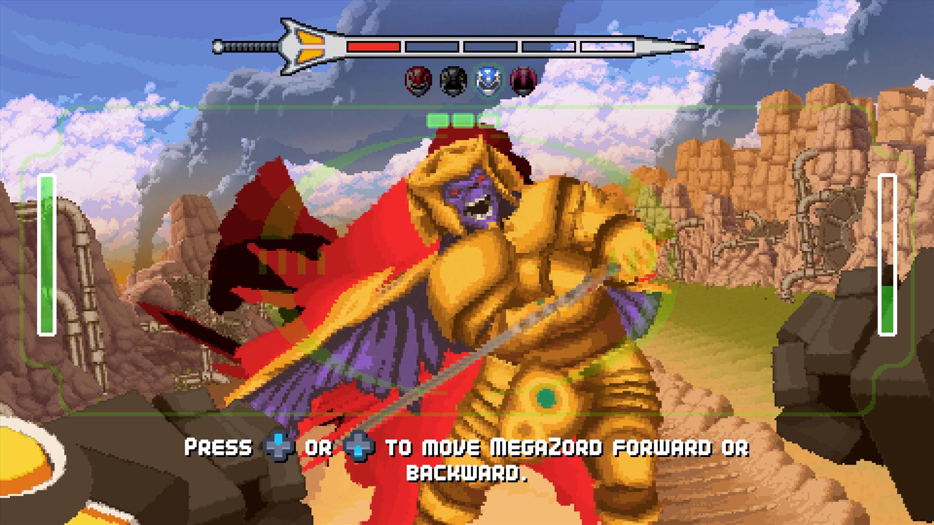 After you get through the stage, you become in complete control of your Megazord. The animation leading up to this fight is pretty slick too. Then the game becomes Punch-Out. You can dodge left and right, and even hit combination moves with a left and right punch. The goal here, is to avoid the enemy attacks, and counter when you can. In multi-player, one of the players takes control unless they are defeated. Then it goes to the next in line. Once you've beat the gold off Goldar, you can summon your sword. Megazord here even picks it up like he does in the show, which is hilarious to me. You then have a certain number of seconds to put the big kaiju like monster away. Then you strike a pose. These stages are super cool, and I wish the entire game was more like this.
