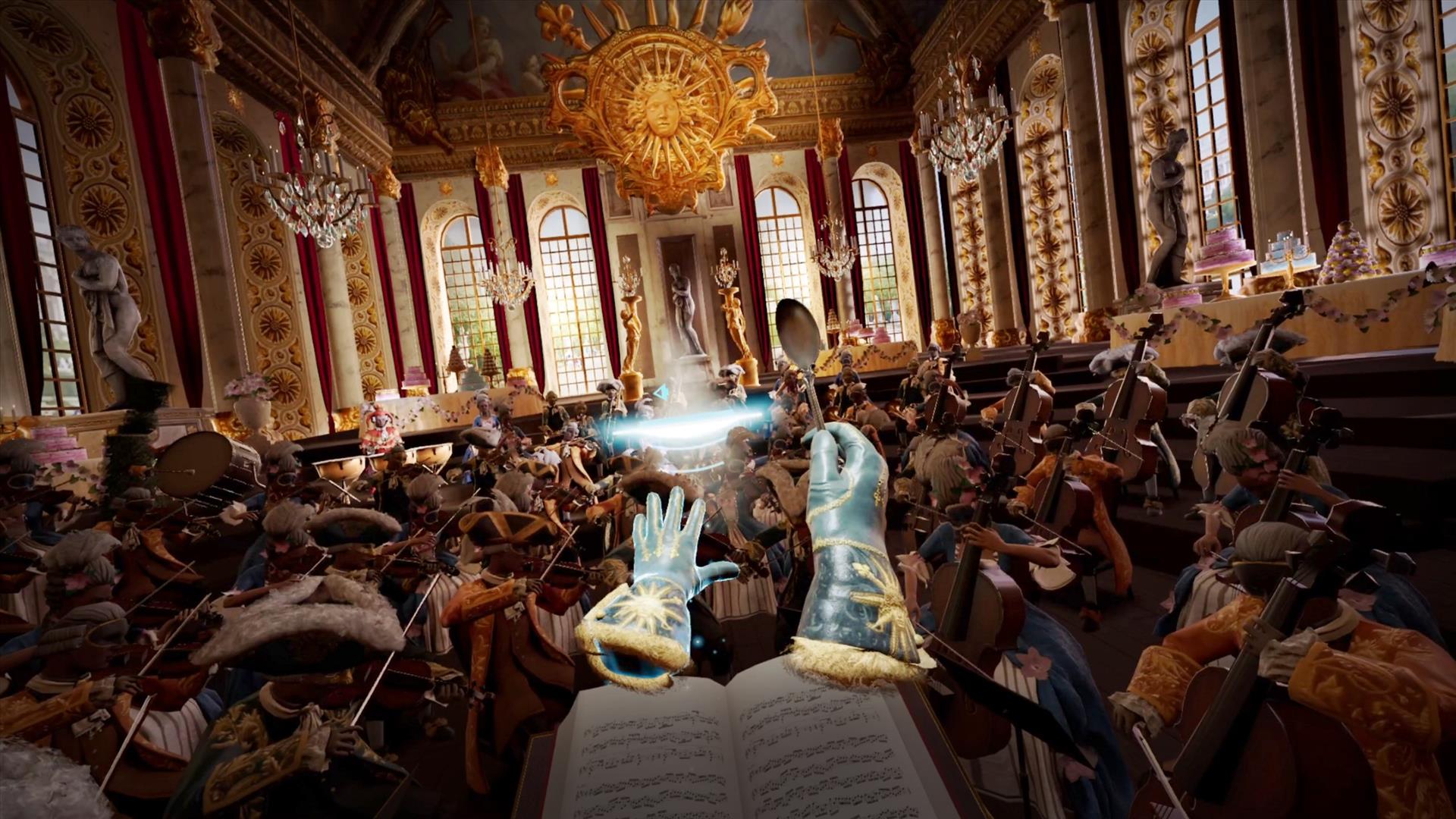 The game rewards you with unlocks, like new songs, and outfits for your orchestra. You get these from beating a song with a 4 or 5 rating note. The butler will even bring your champagne in a new glass if you're really good, or one of the tomatoes if you're really bad. There is no advice or anything. It's just on to the next one. The outfits are pretty funny, and again, the soundtrack isn't robust, but it's enough to keep you busy for as long as your battery lasts. The coolest thing to unlock are the different environments. Instead of conducting to a theater, you can change the entire backdrop to the revolution, full with cannons, and explosions. You can also change your baton, and your own gloves. I don't think there's a cooler VR experience.