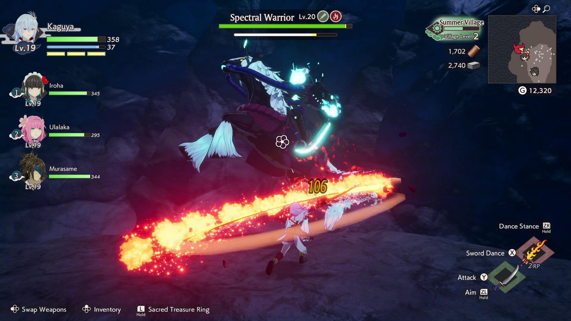 The protagonist is also granted a series of “sacred instruments” from the village gods, which do double duty. Their primary use is to clear various environmental obstacles, but they can also perform ultimate-style attacks and heal party members. This probably all sounds like a lot, but in practice it is simple and fluid. The player can take along up to three other CPU-controlled party members, who tank baddies quite nicely. Nothing here is too difficult, and I generally found combat to be a light way to pass the time each in-game day. Need to kill a few hours waiting for that homie to arrive at the restaurant? Go wander around and kill some toad archers!