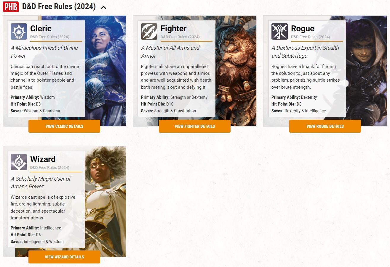 Not only are these choices free, they're stress-free. While still playing like the 5e we've come to love and hate over the past 10 years, they're boilerplate archetypes. According to the Class Overview chart that kicks off character creation in the 2024 D&D Player's Handbook, those four character classes also rate very low in complexity to play. Fighters and Rogues are low complexity (the only two that are). While Clerics and Wizards are rated average complexity. You can save the high-complexity Bards, Druids, Monks, Sorcerers, and Warlocks for later.