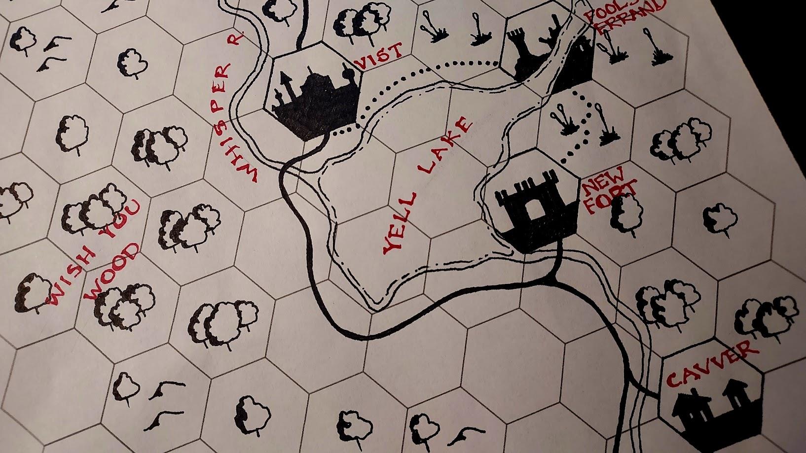 There's a snippet of a map around Daggerford in the Forgotten Realms, drawn by the incomparable Mike Schley. But I'm feeling old school lately, so I looked up the hex map icons from the D&D world of Mystara, the first hex maps I ever saw. Those were back in the 1980s, which was the 20th century. (I'm helping orient our younger readers.) Those hex maps were simple, inorganic, and sort of an eyesore. But there's a beauty in their simplicity, which you appreciate even more if you're drawing one yourself, like I did here. Here's my unnamed province, each hex hand drawn to imitate the rubberstamped hex maps of the Reagan era.