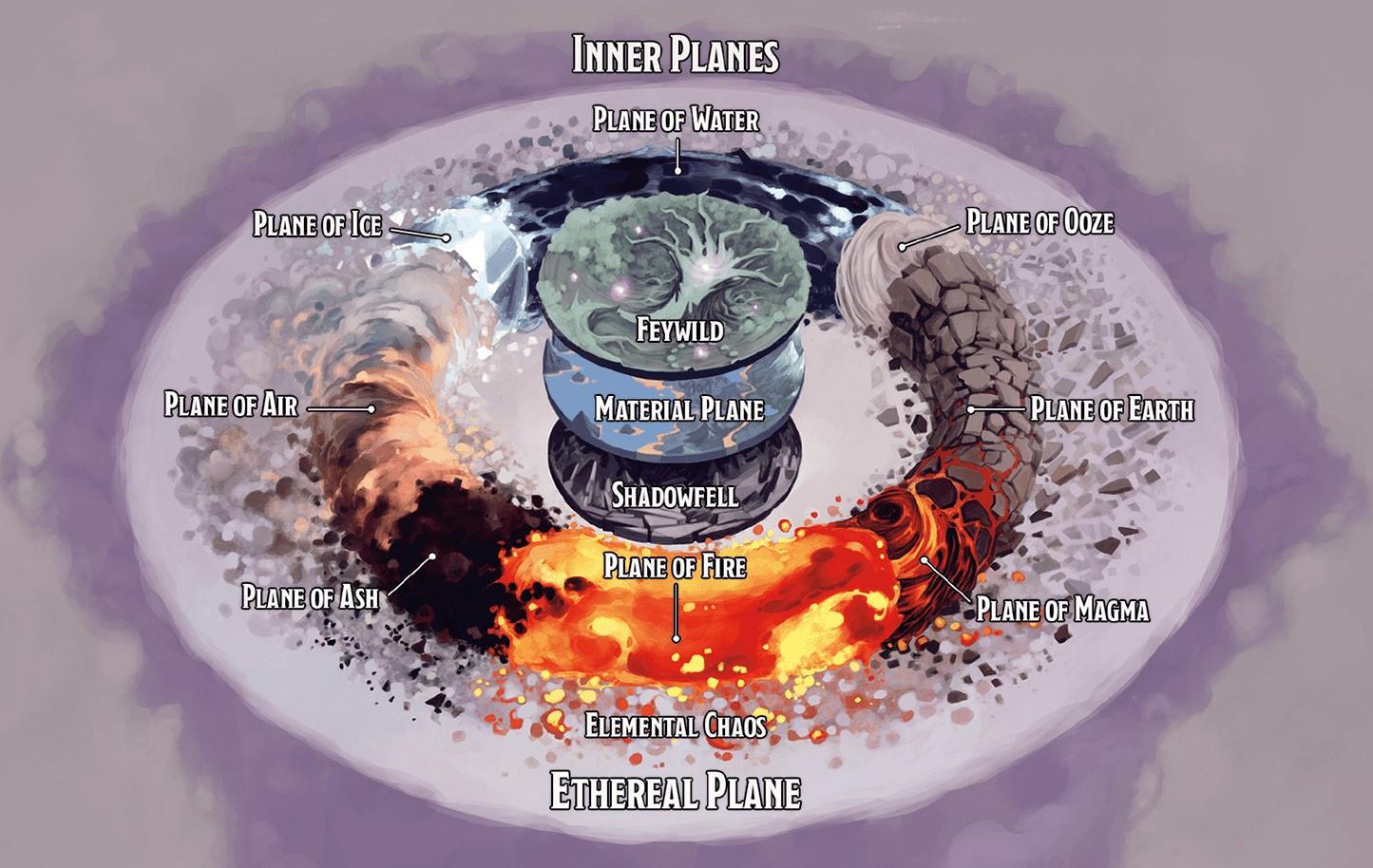 Arcane spellcasters (sorcerers, warlocks, wizards) draw their power from the Inner Planes: the Elemental Planes of Water, Earth, Fire, and Air, along with the para-elemental planes bordering them: Ooze, Magma, Ash, and Ice. Let’s also include the Elemental Chaos on the fringes, where elemental forces clash wildly.
