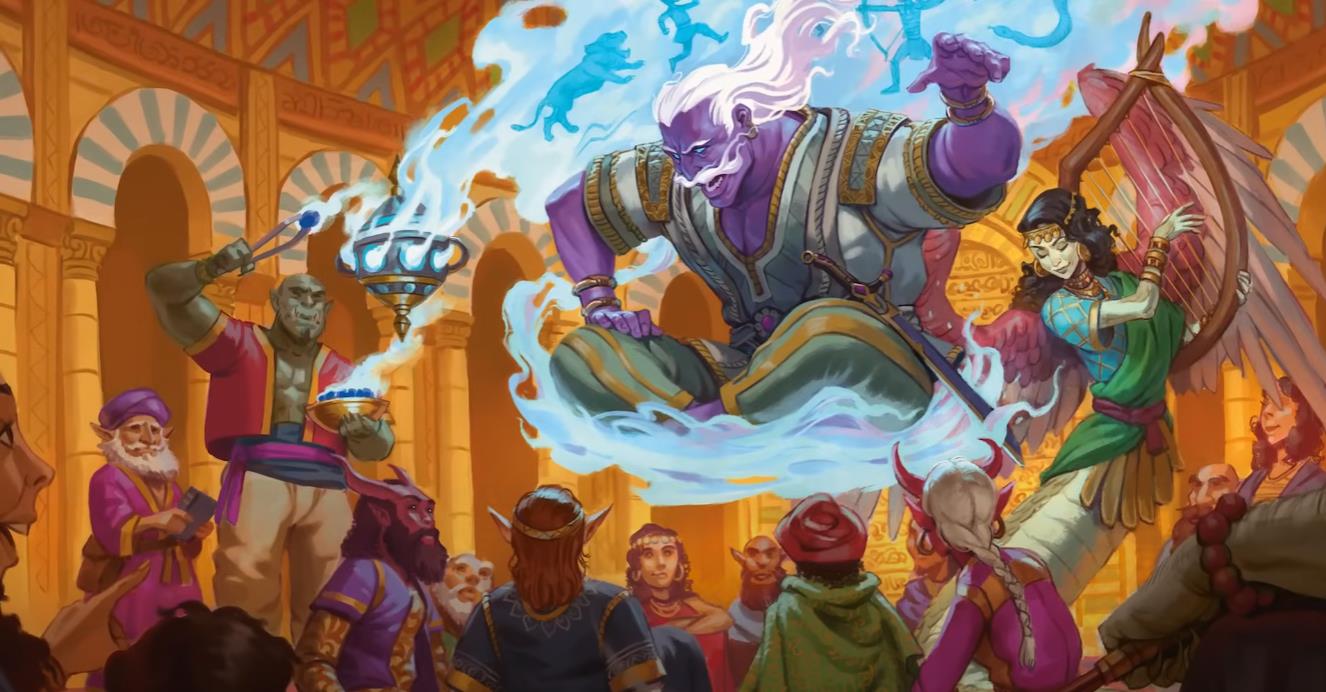 The Infinite Staircase itself is a "dreamlike expanse" with doors punching their way into a bunch of different fantasy (and science-fantasy) worlds. The staircase is overseen by a genie who fulfills people's wishes with the aid of adventurers like you. It's an appropriately super weird premise for super weird 1st Edition D&D adventures that have all been revamped for 5th Edition players and...modernized sensibilities and cultural sensitivities, let's say.